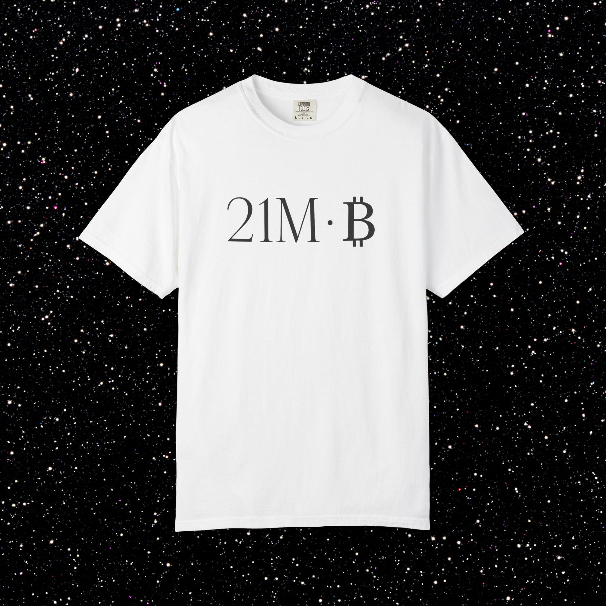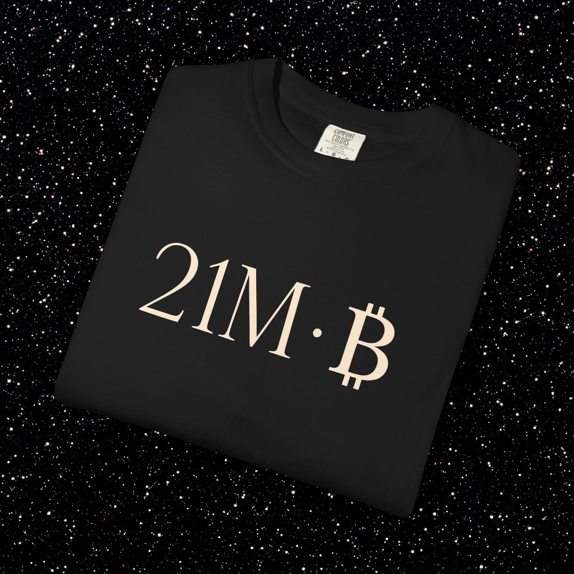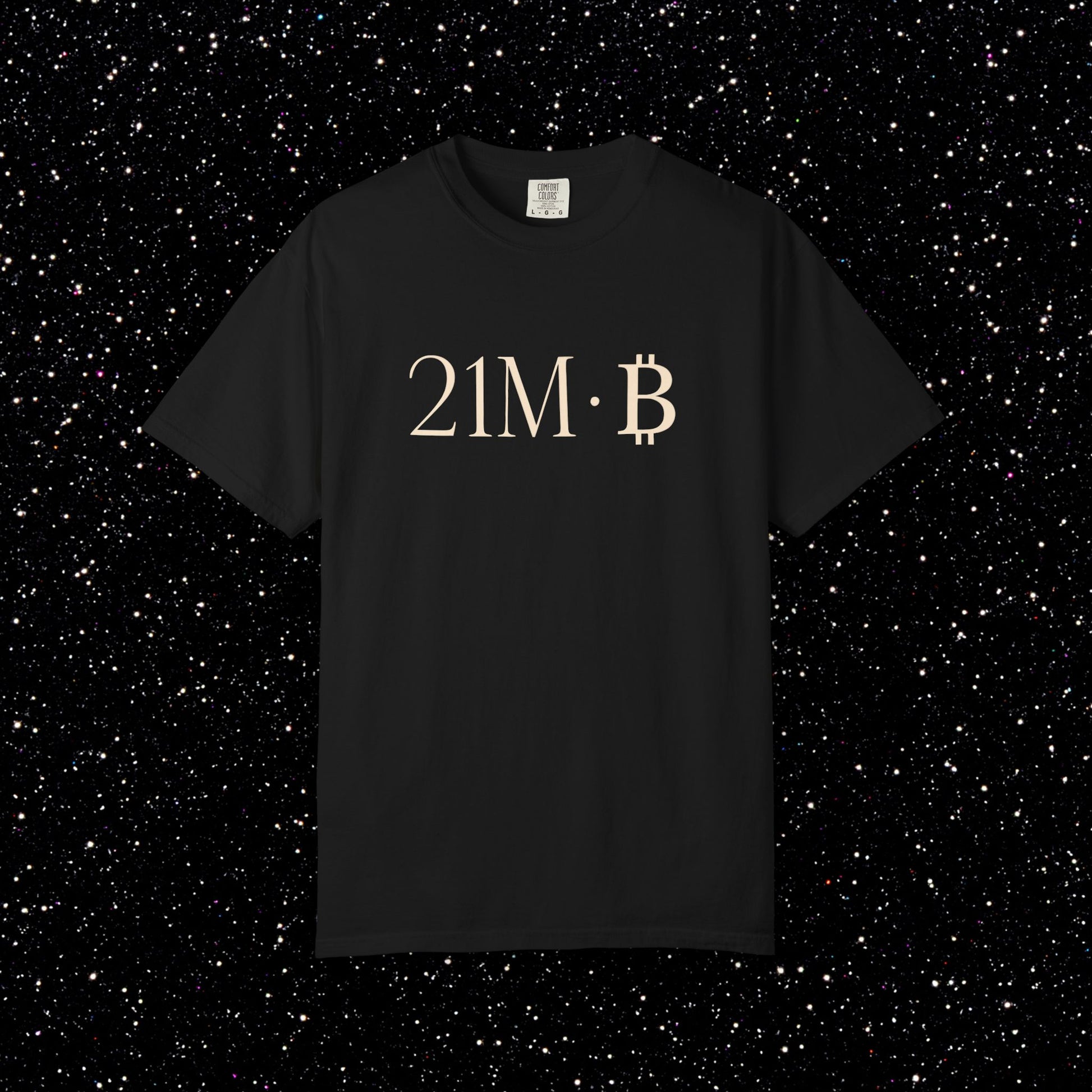 The 21M • ₿ tee keeps it ultra-clean with thin serif typography, balanced spacing, and a soft vintage grain that feels timeless instead of trendy. No graphics. No noise. Just the signal.