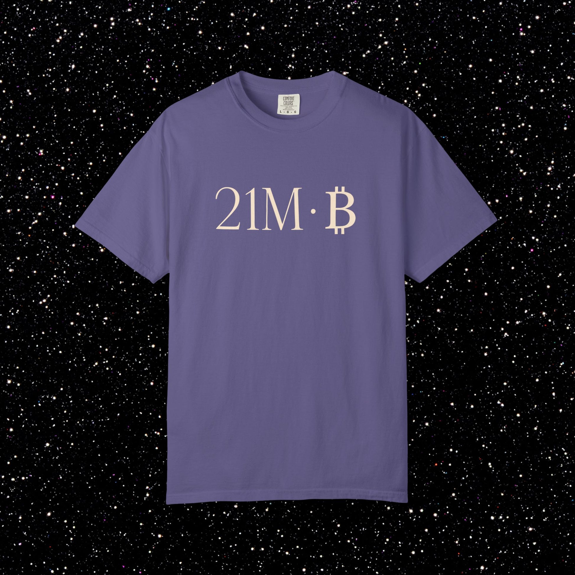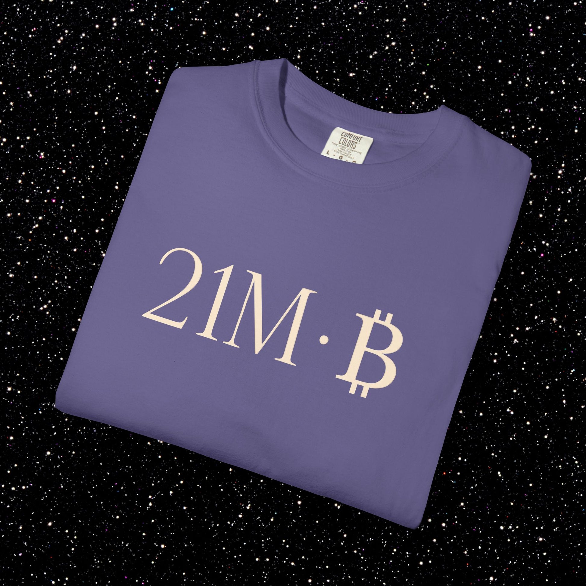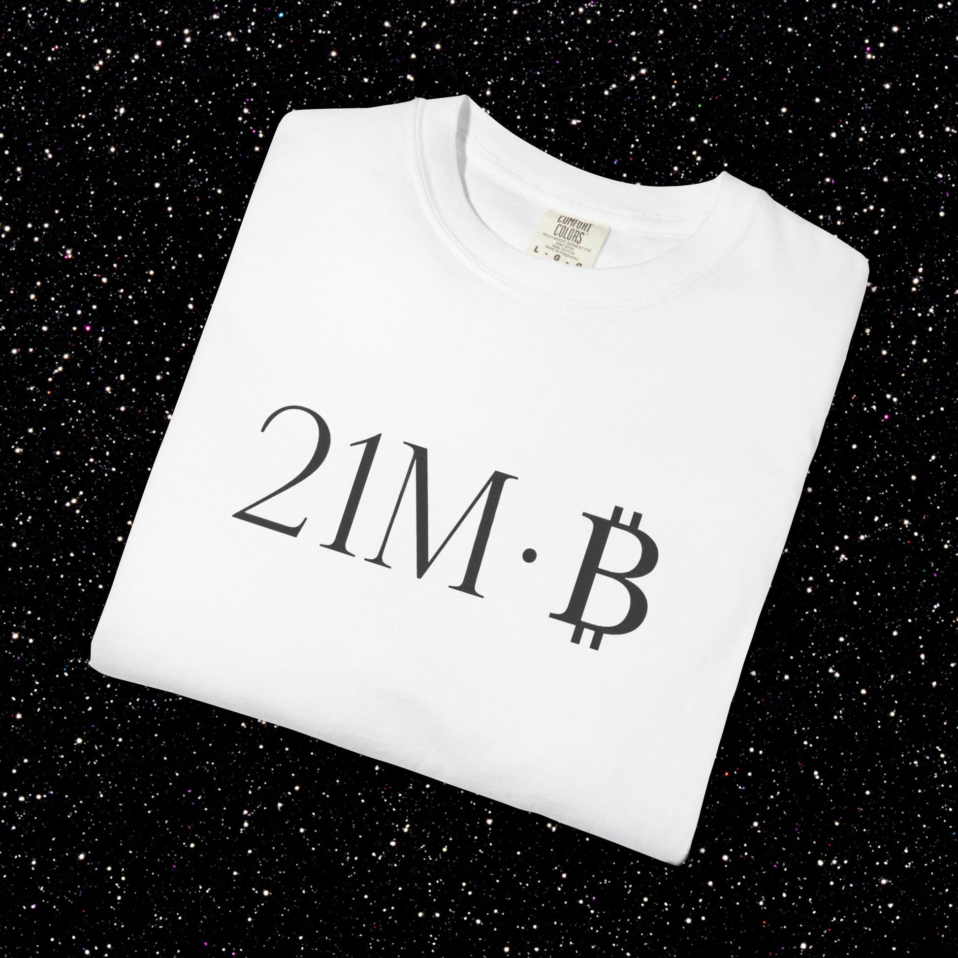 The 21M • ₿ tee keeps it ultra-clean with thin serif typography, balanced spacing, and a soft vintage grain that feels timeless instead of trendy. No graphics. No noise. Just the signal.