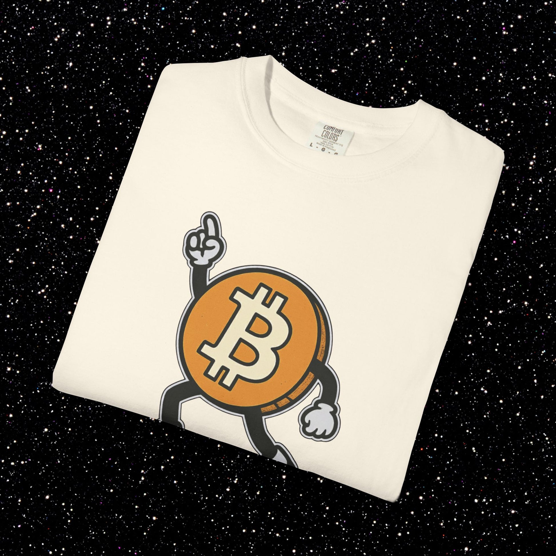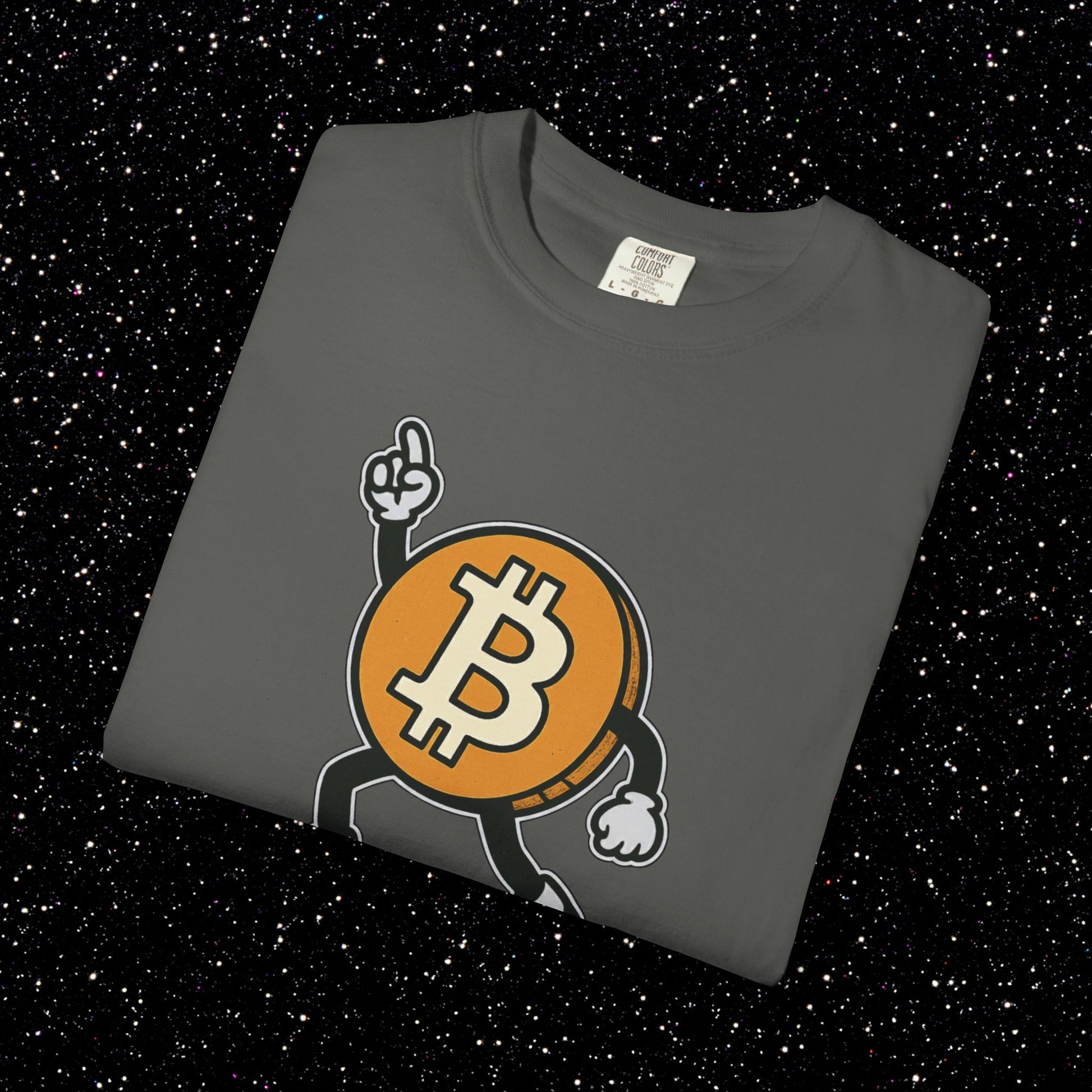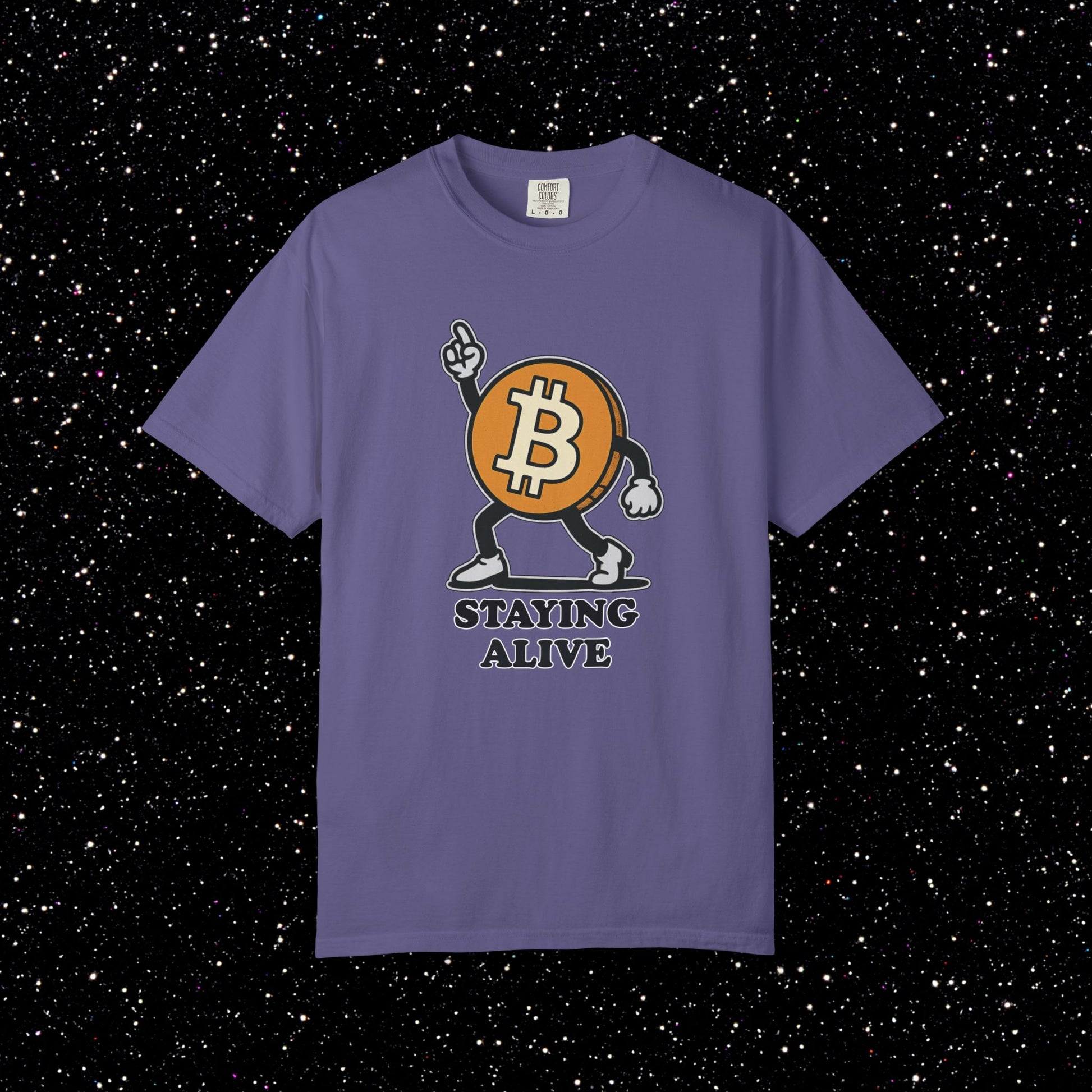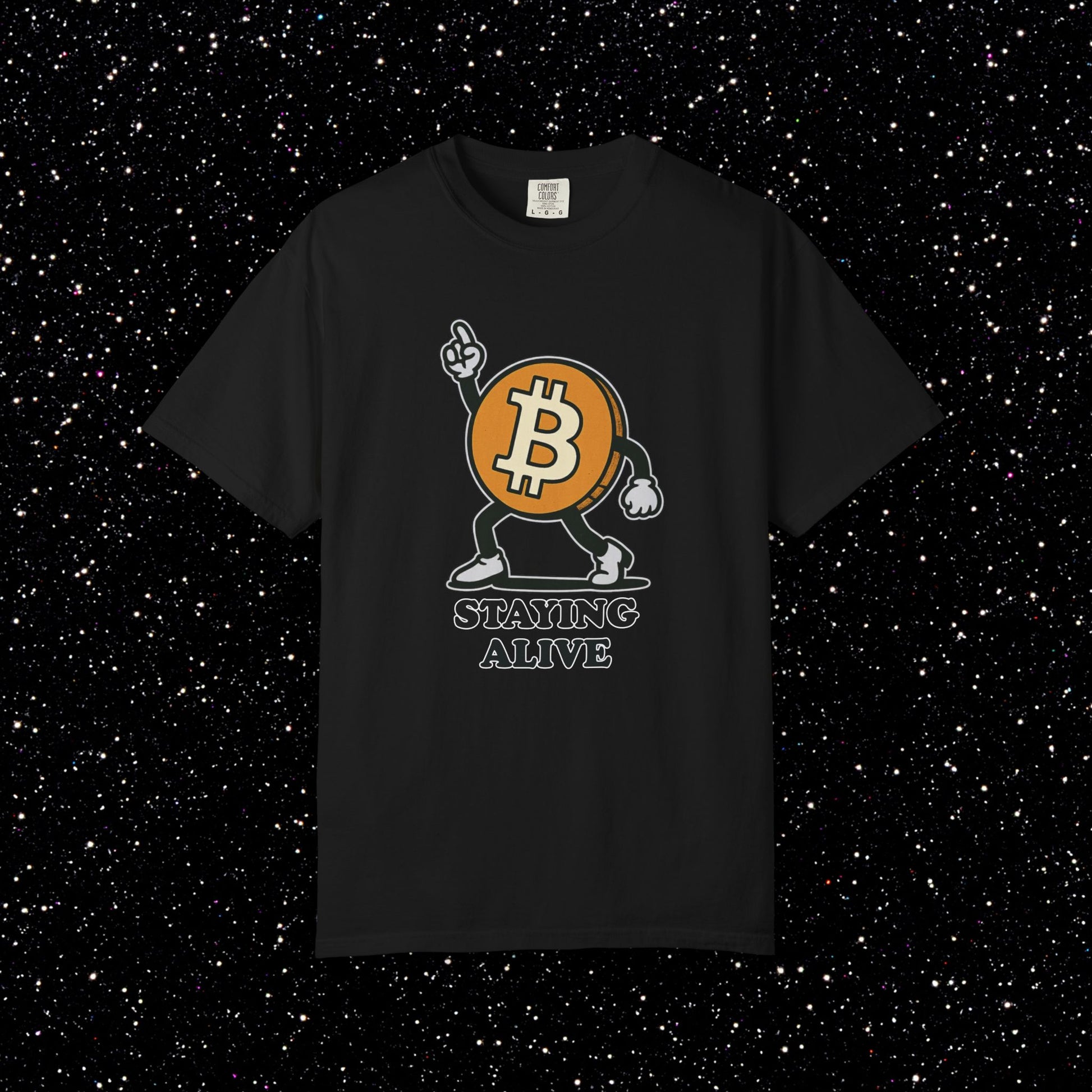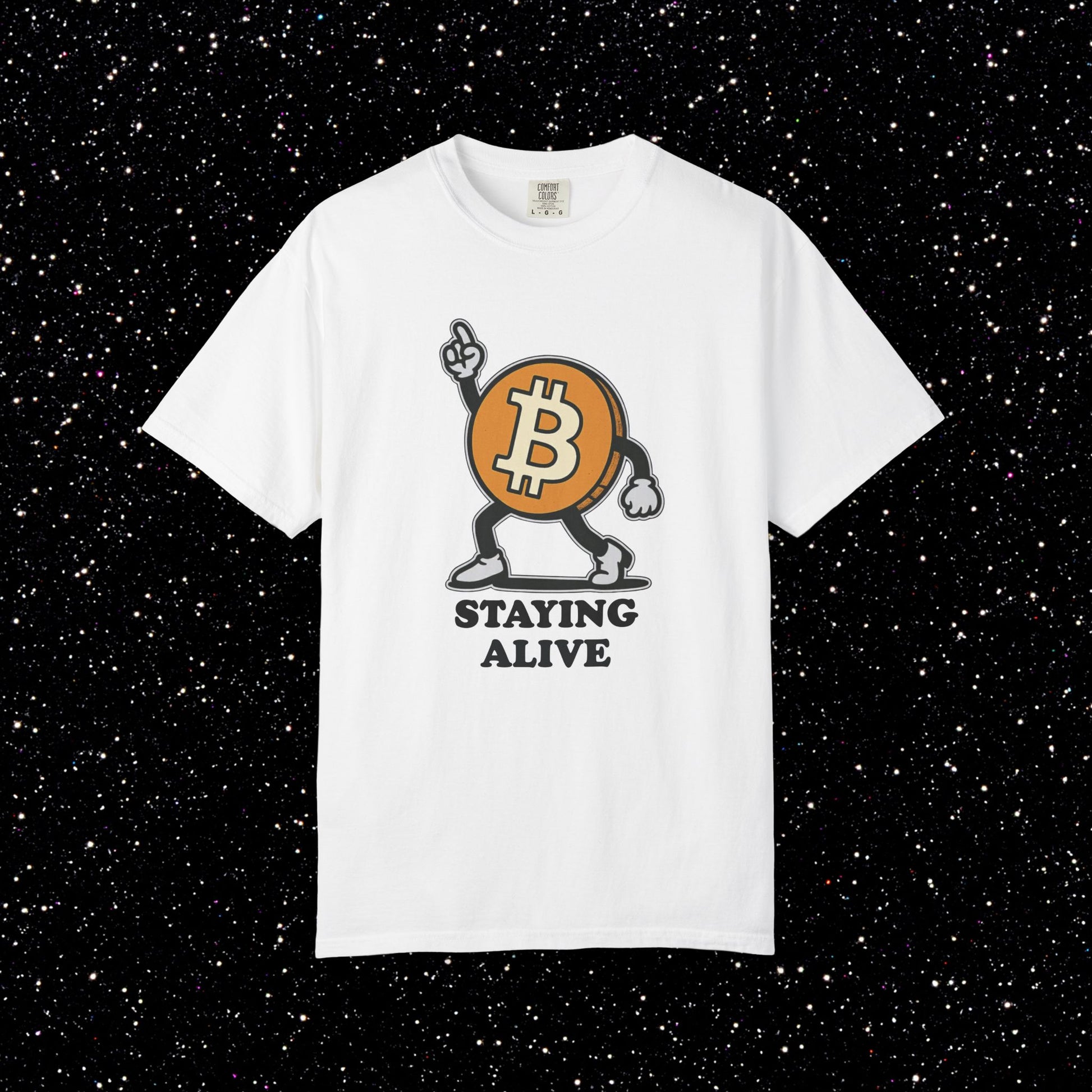 The Bitcoin logo hits the dance floor in full swagger. This tee features a cartoon ₿ character with arms and legs breaking out the classic “Staying Alive” pose. Retro energy, meme culture, and pure bull-market optimism all in one design. Perfect for anyone who keeps their node running and their vibes high.