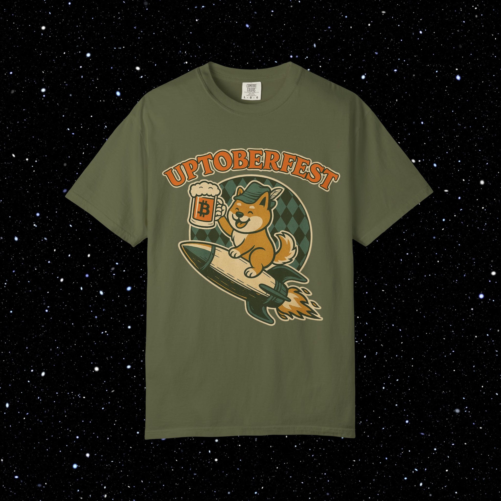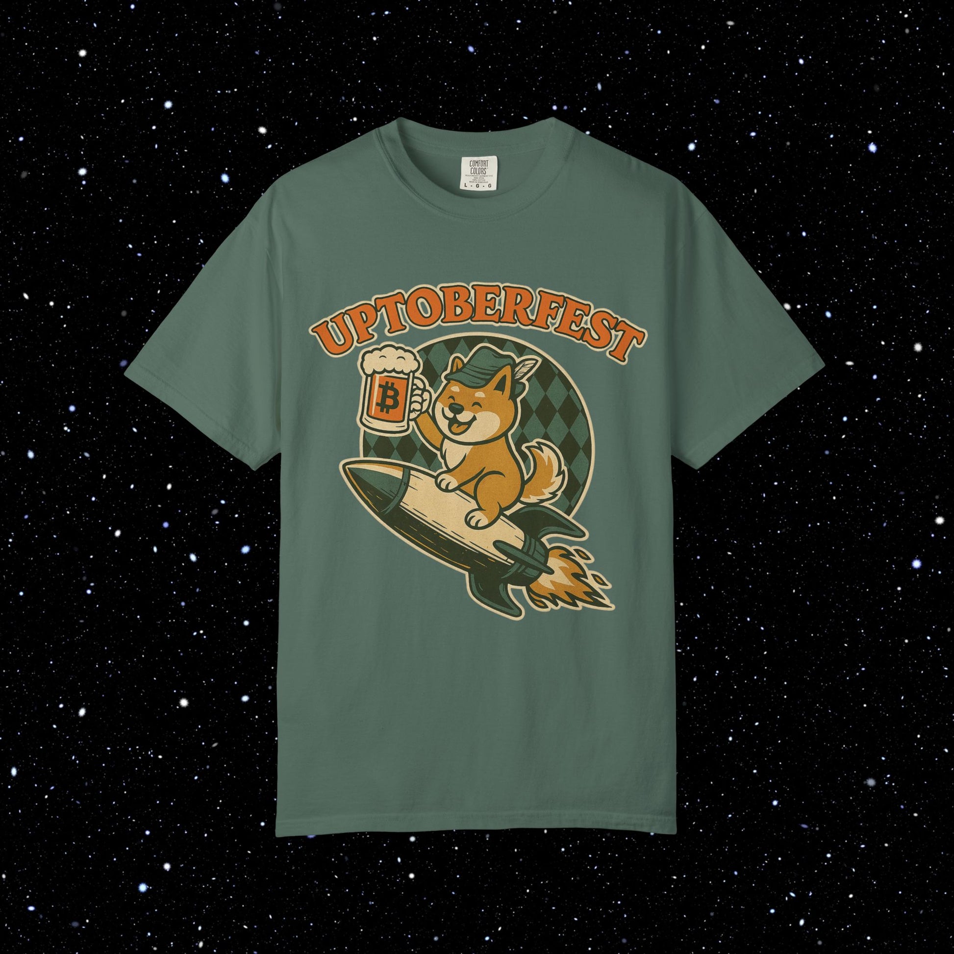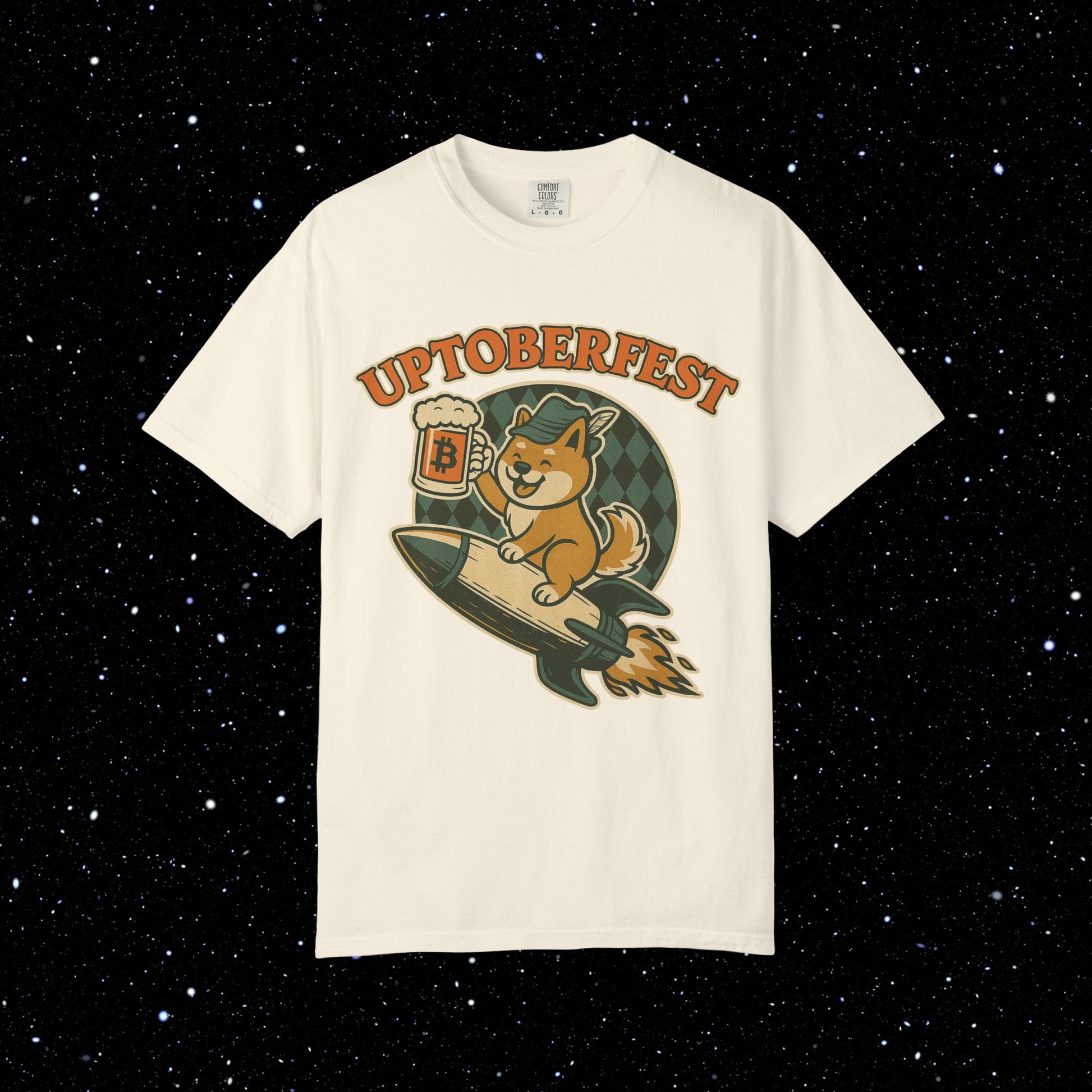 Raise a stein to Uptober. This vintage-inspired tee celebrates Bitcoin’s favorite month with Oktoberfest flair. A rocket-riding Shiba in a Bavarian hat, hoisting a frothy beer mug stamped with the ₿, passing by a lozenge textured moon. Bold outlines, distressed textures, and warm retro tones make this shirt feel like a festival poster you can wear.