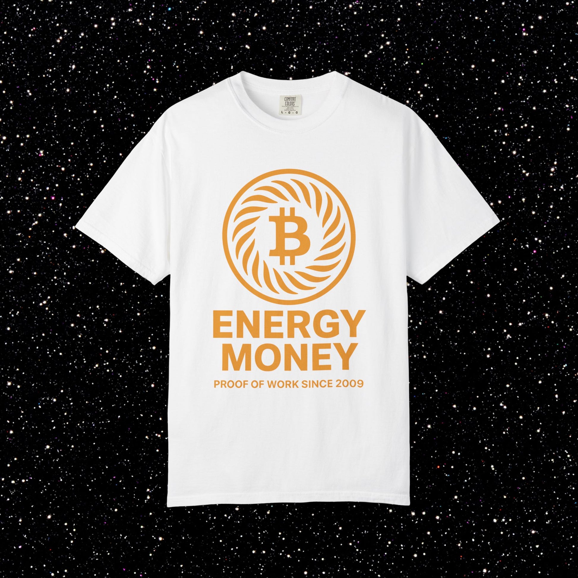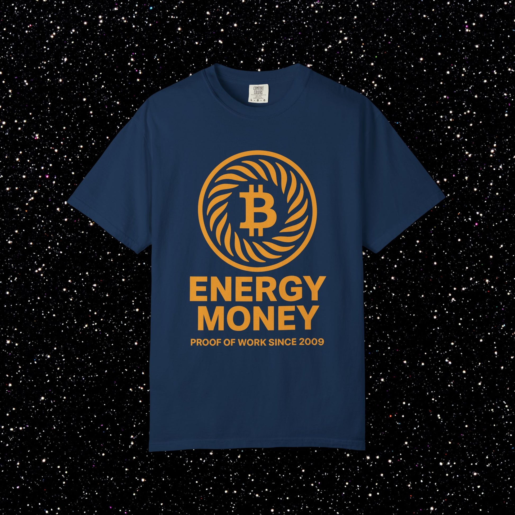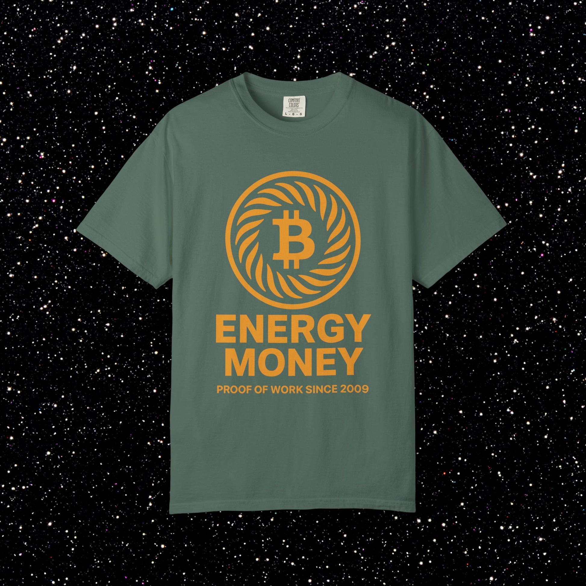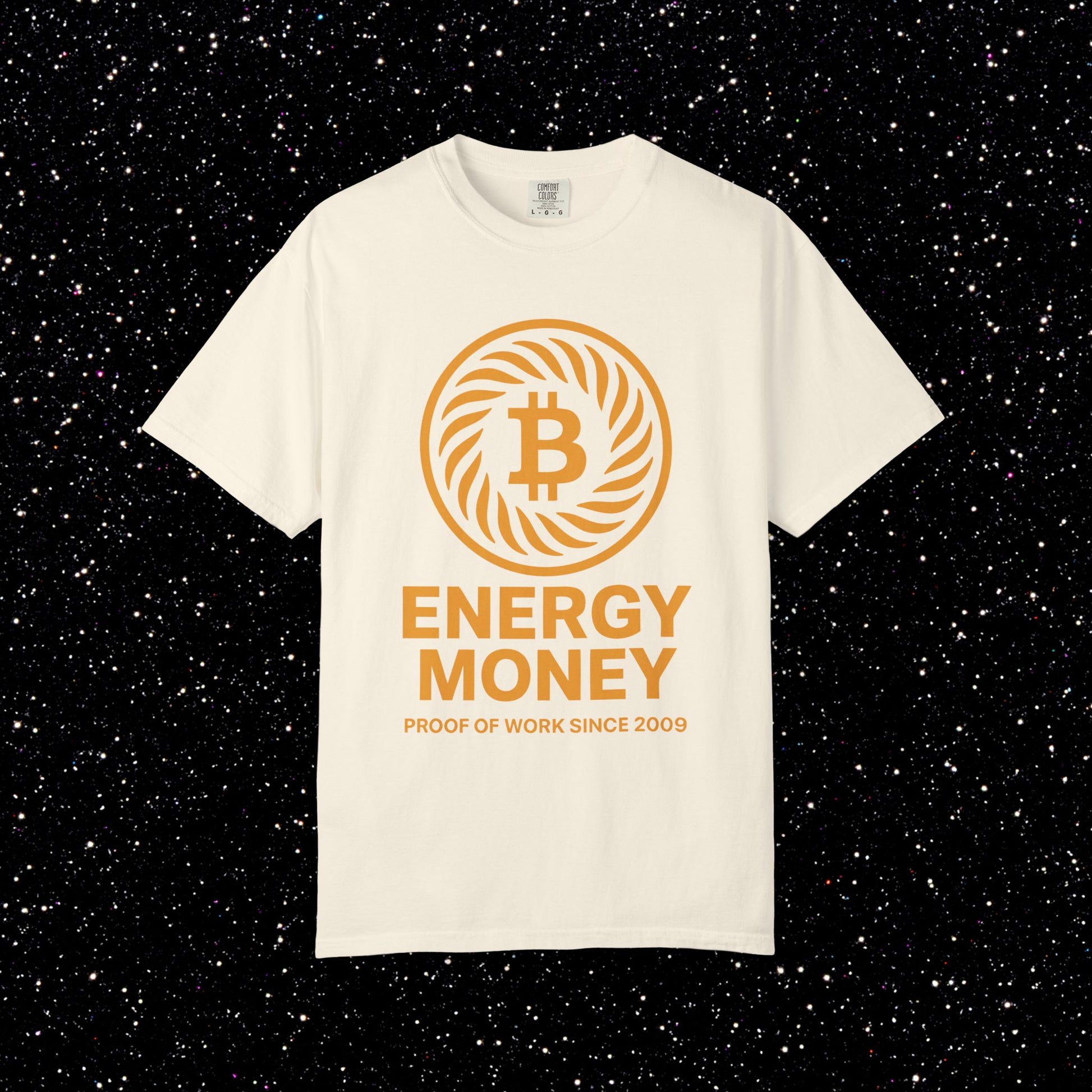 The Energy Money Tee features a turbine-inspired Bitcoin emblem paired with clean mid-century typography. Its vintage gold-orange print captures the look of classic 1970s energy company logos.