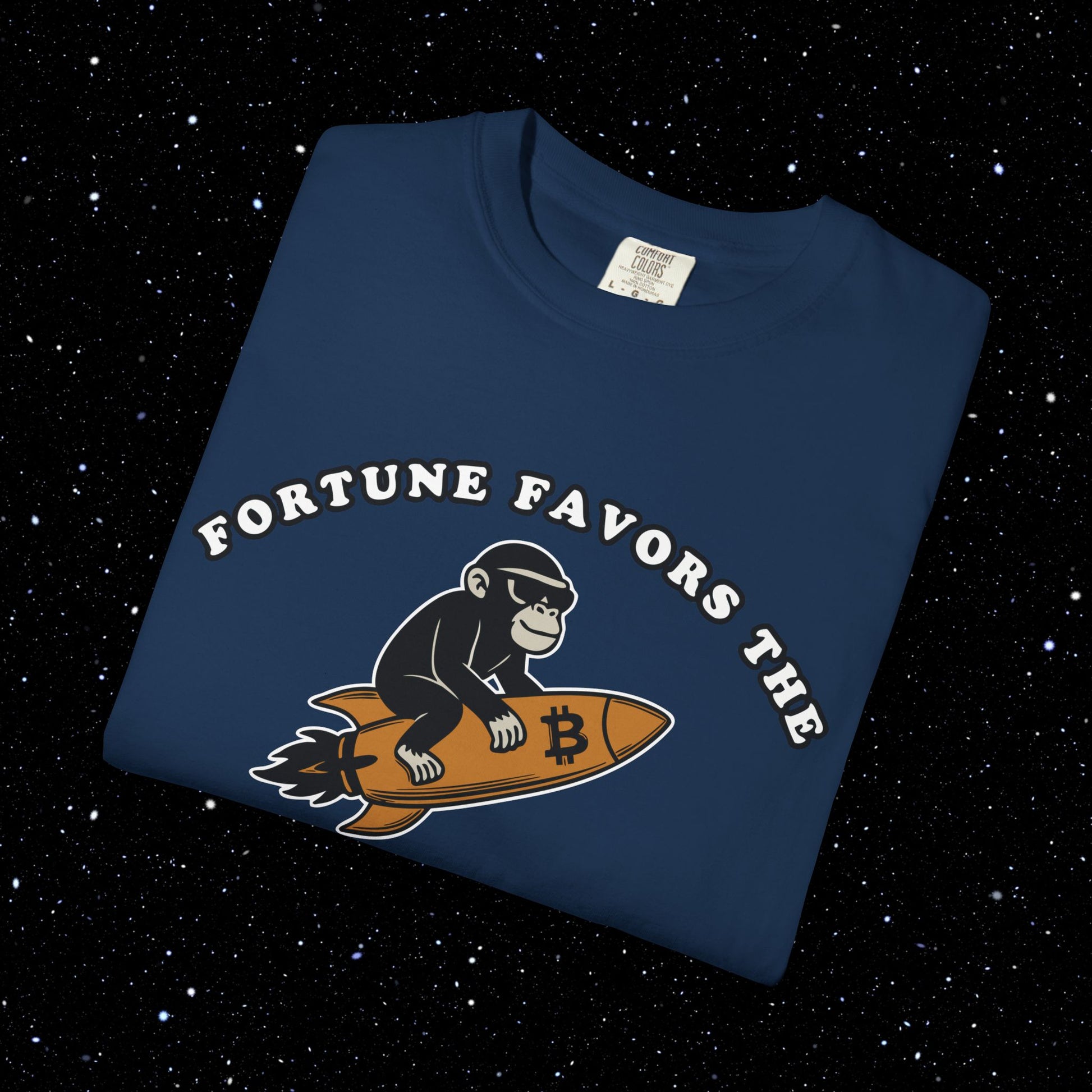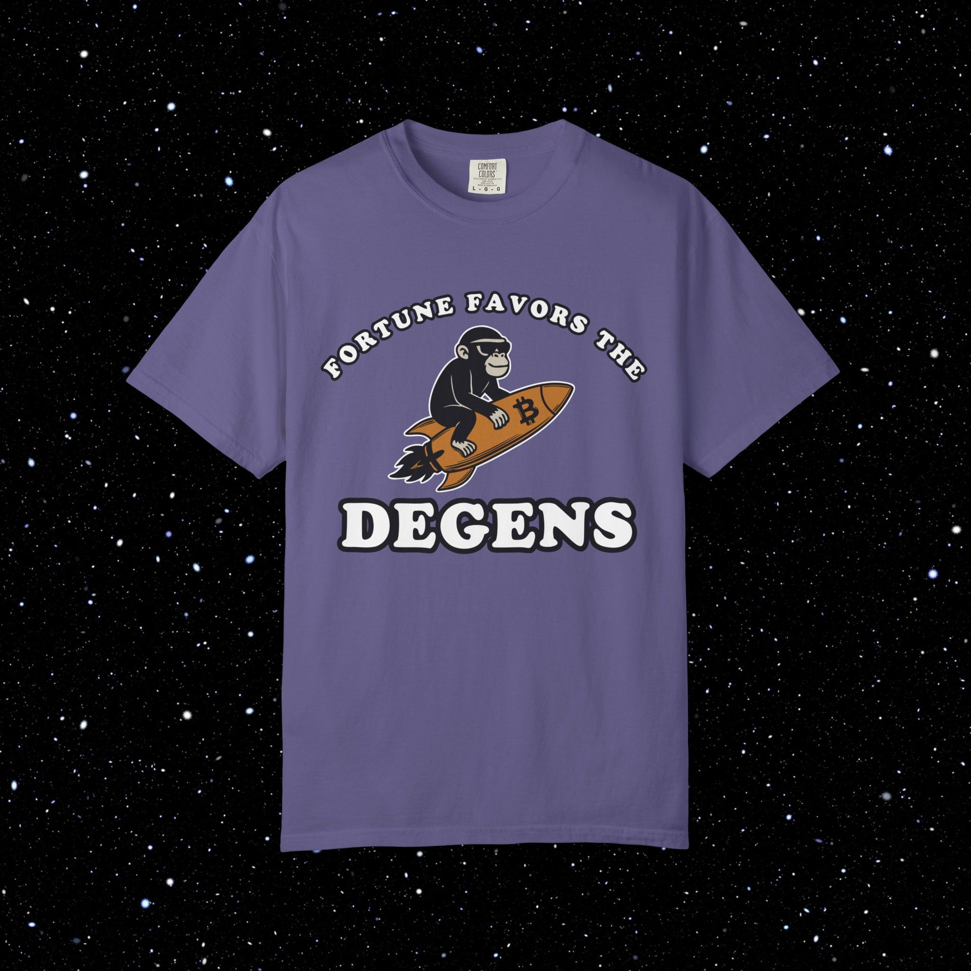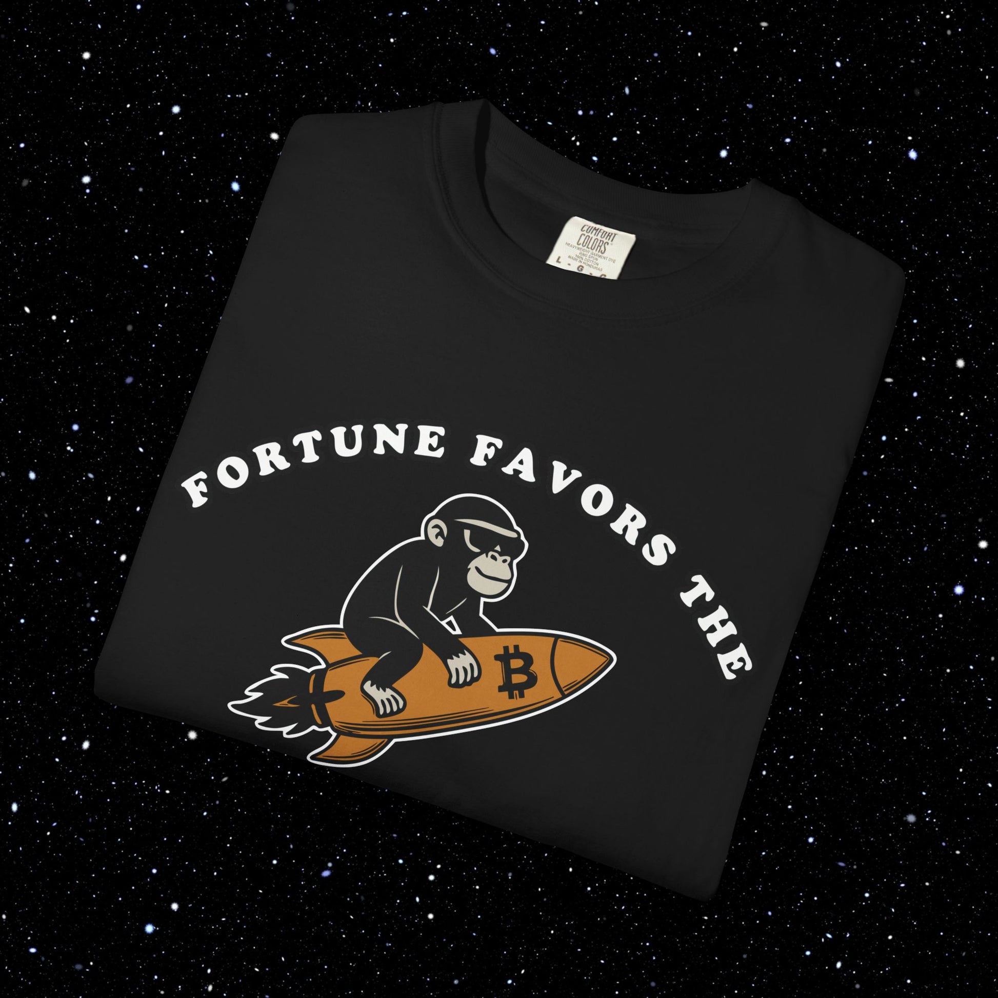 For the ones who can’t resist the next moonshot. This design features a smug ape blasting off on a Bitcoin rocket with bold lettering that says what every trader’s thinking: Fortune favors the degens. It’s a nod to those who ape in first, think later, and still find a way to laugh through the dips.