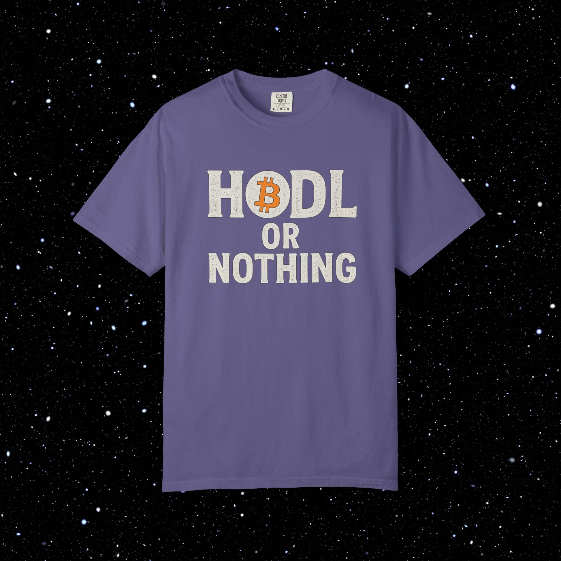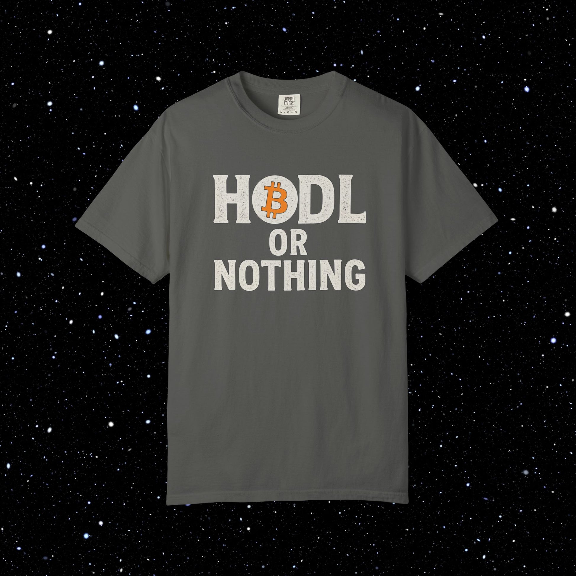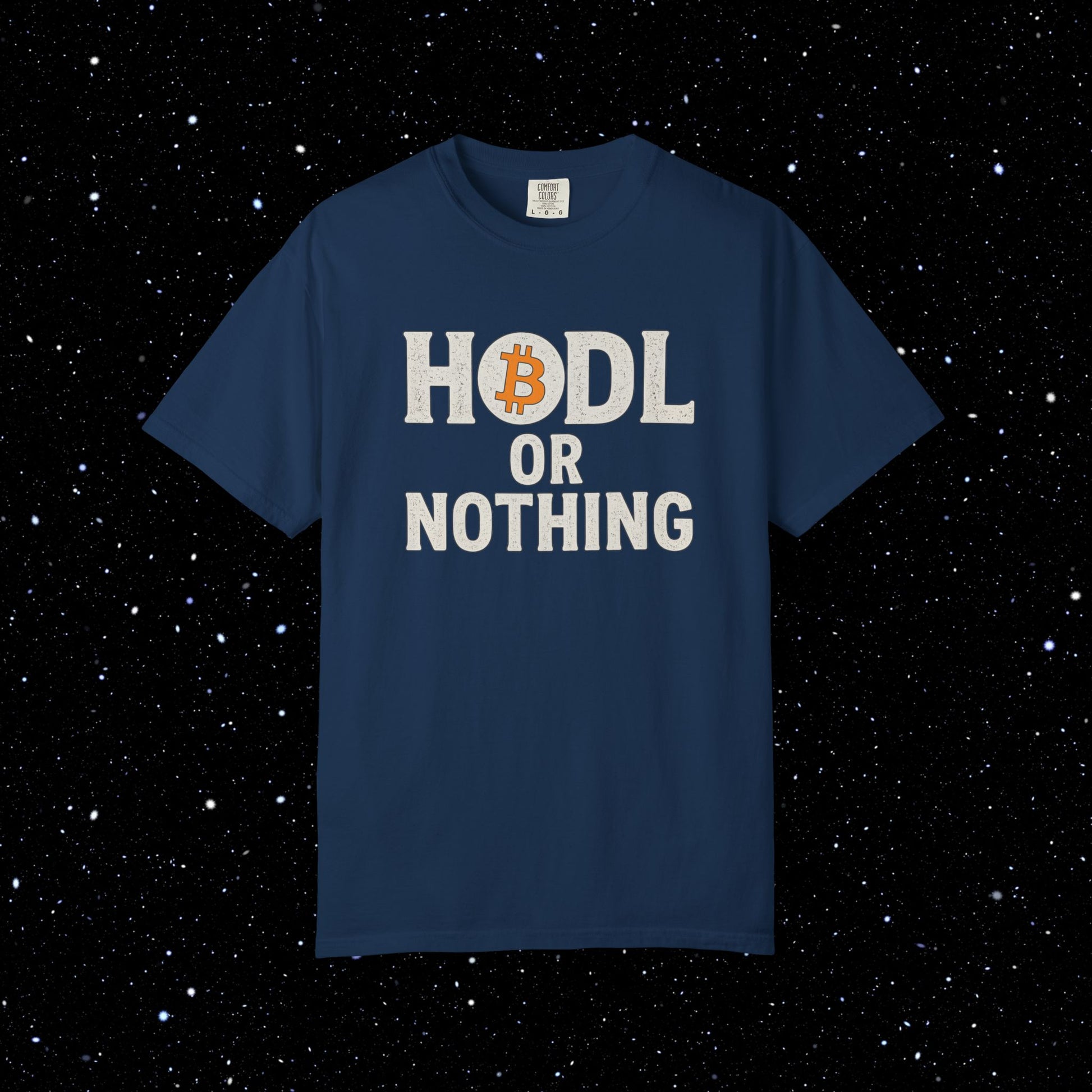 This tee throws it down plain and simple: It’s HODL or Nothing. Bold distressed lettering gives it that worn-in pleb-core vibe, with the Bitcoin ₿ symbol locked into “HODL” as a reminder of what matters.