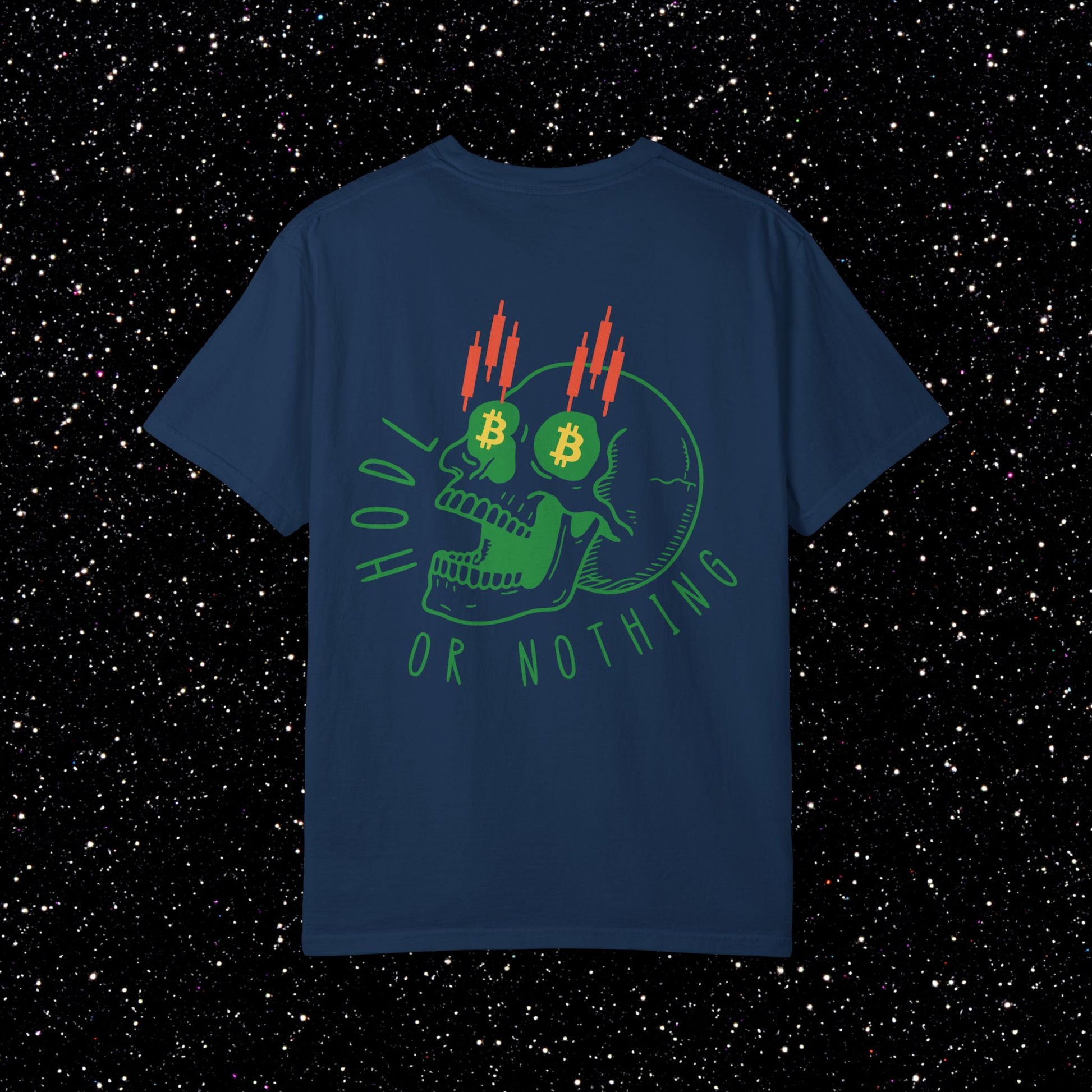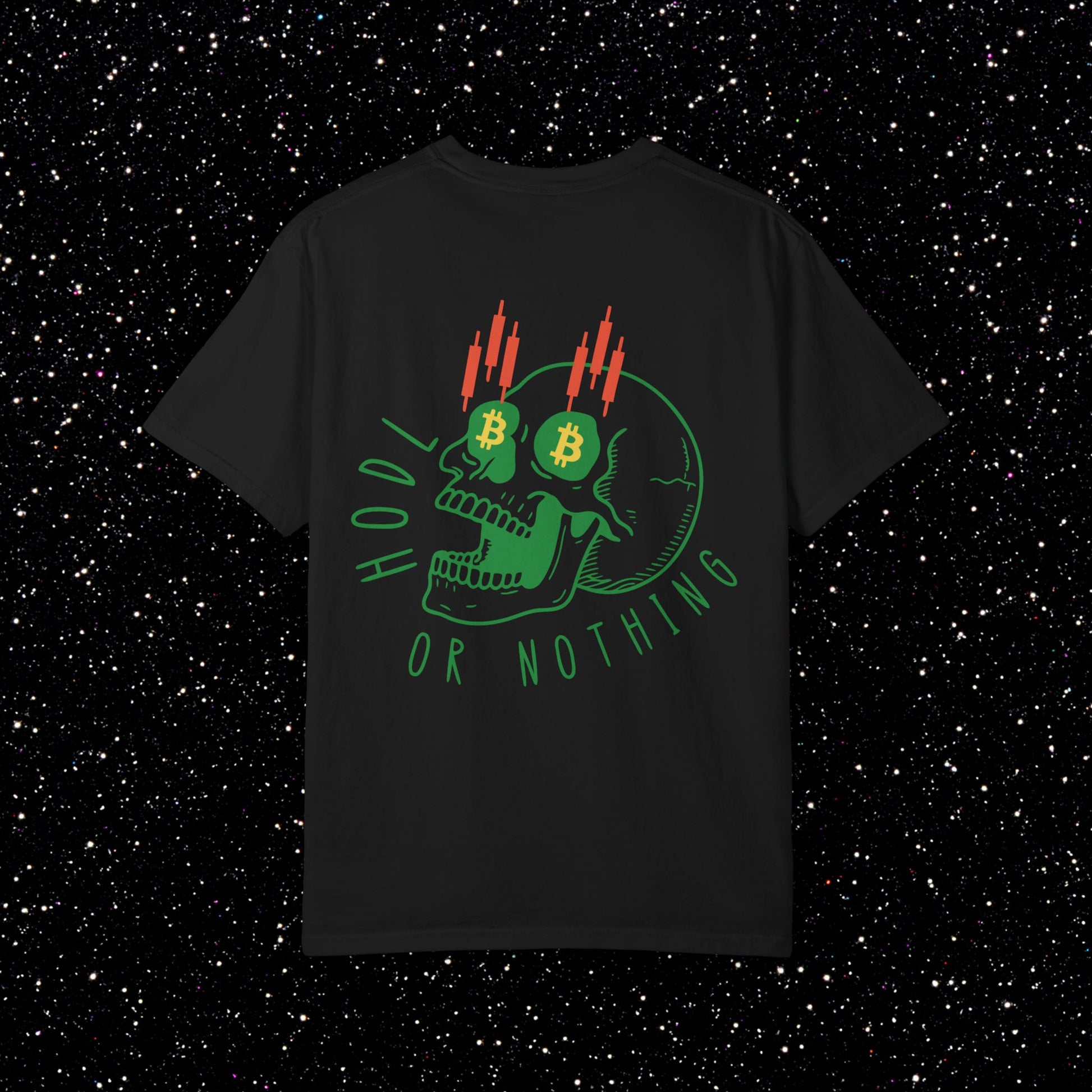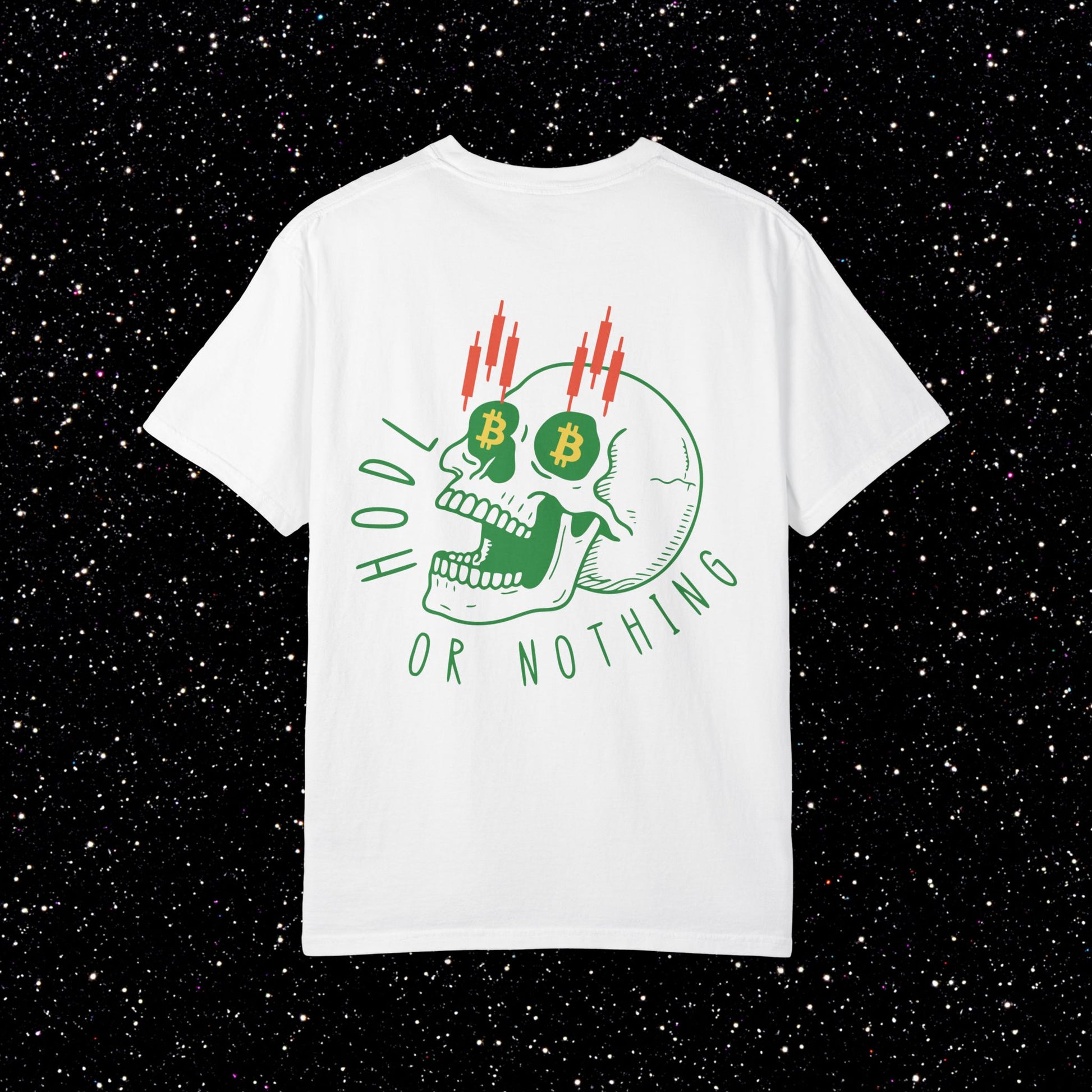 A defiant, underground-energy graphic built for the ones who don’t flinch when the market turns red. The “HODL OR NOTHING” tee features a hand-drawn skeletal profile with Bitcoin-vision eyes and a clean, bold layout that hits hard on black. Retro-green linework, sharp typography, and full crypto-punk attitude make this an instant statement piece.