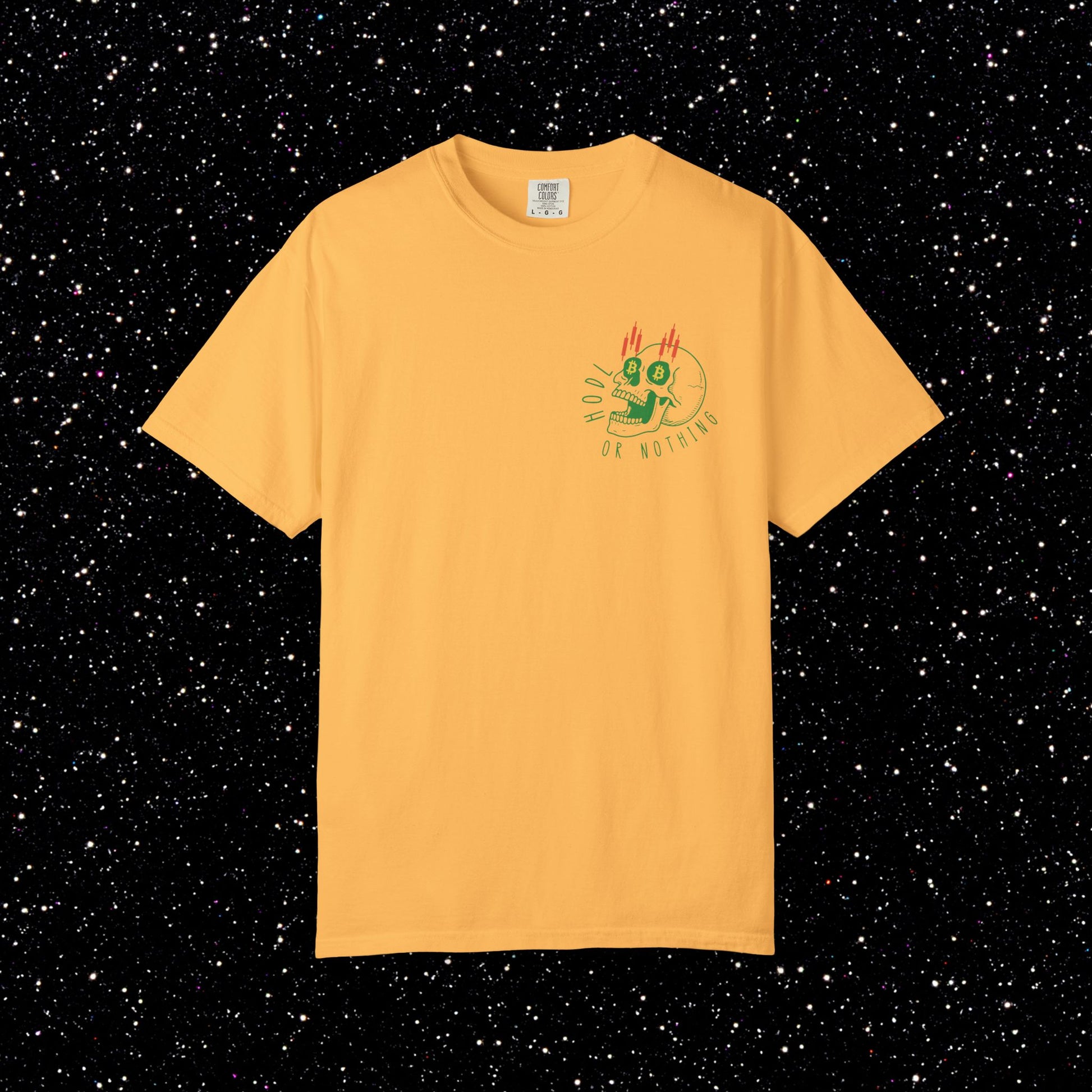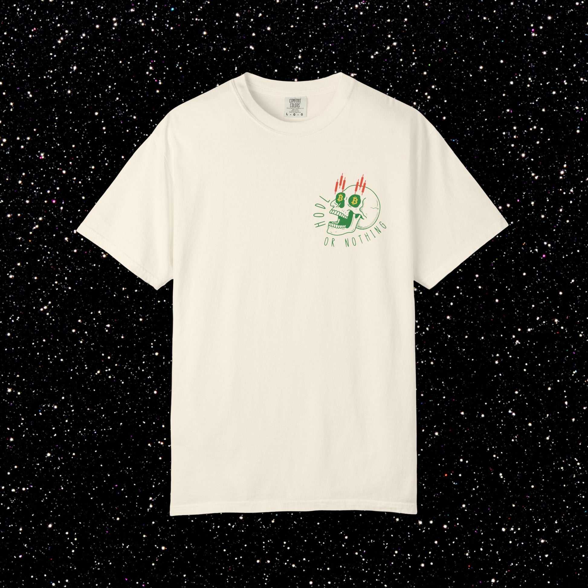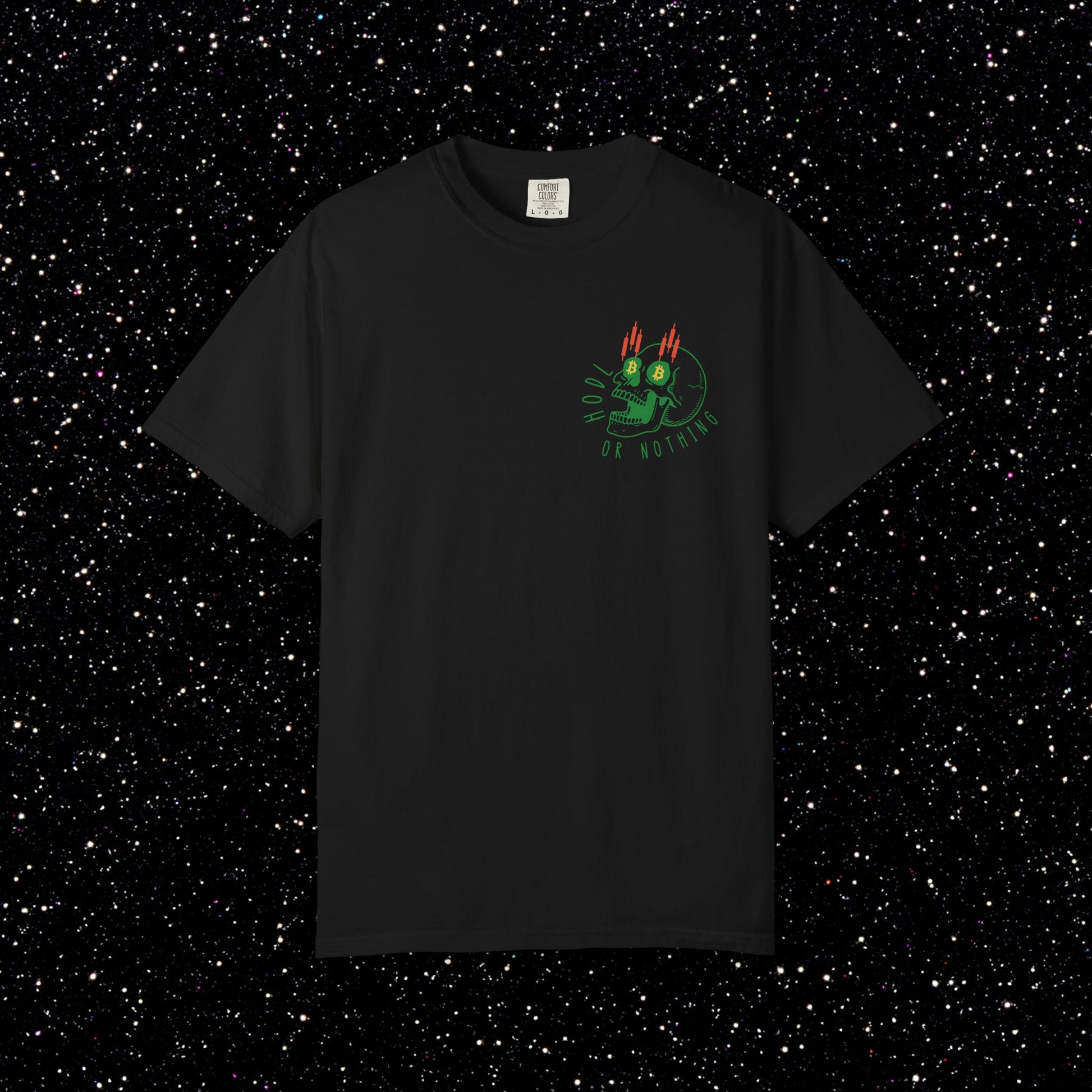 A defiant, underground-energy graphic built for the ones who don’t flinch when the market turns red. The “HODL OR NOTHING” tee features a hand-drawn skeletal profile with Bitcoin-vision eyes and a clean, bold layout that hits hard on black. Retro-green linework, sharp typography, and full crypto-punk attitude make this an instant statement piece.