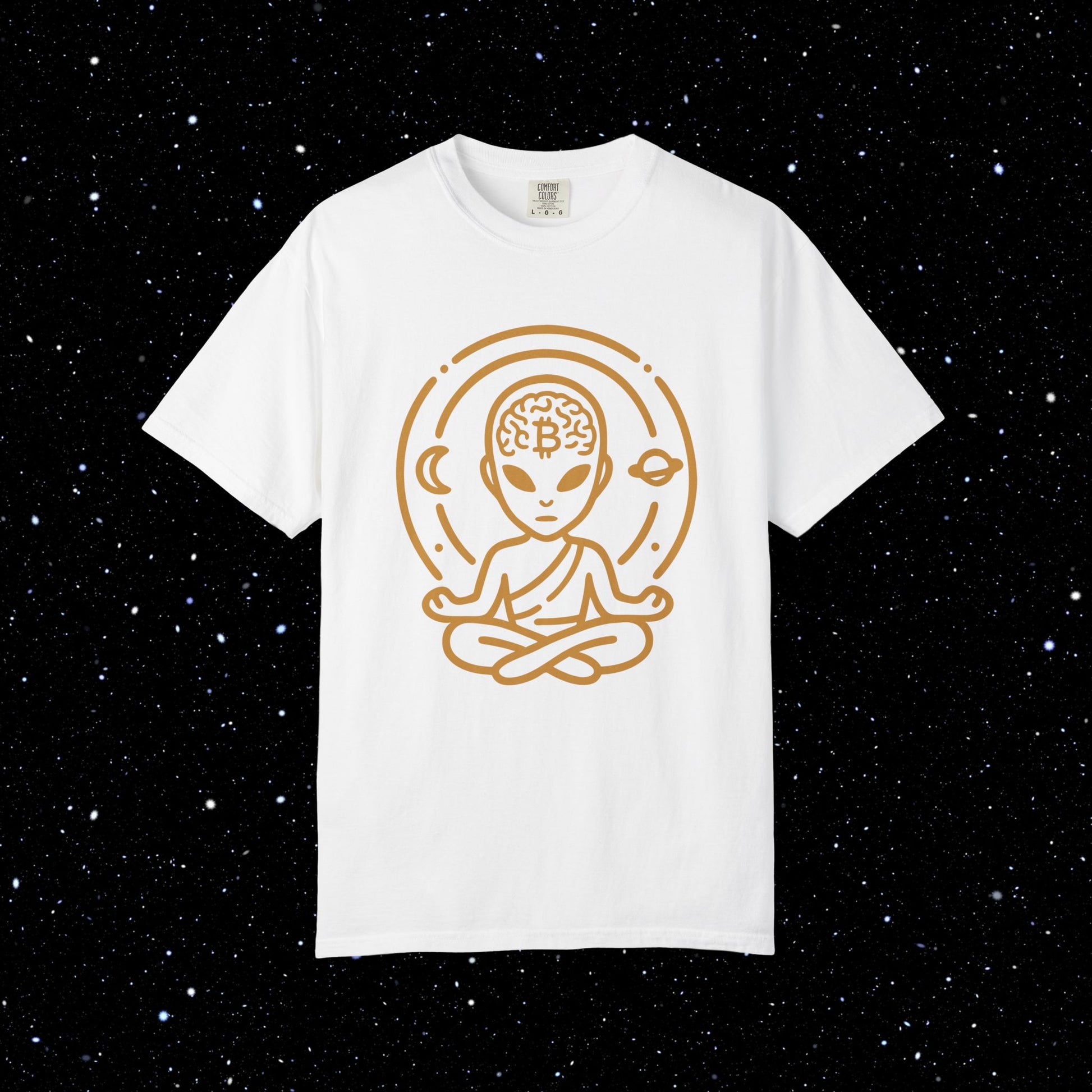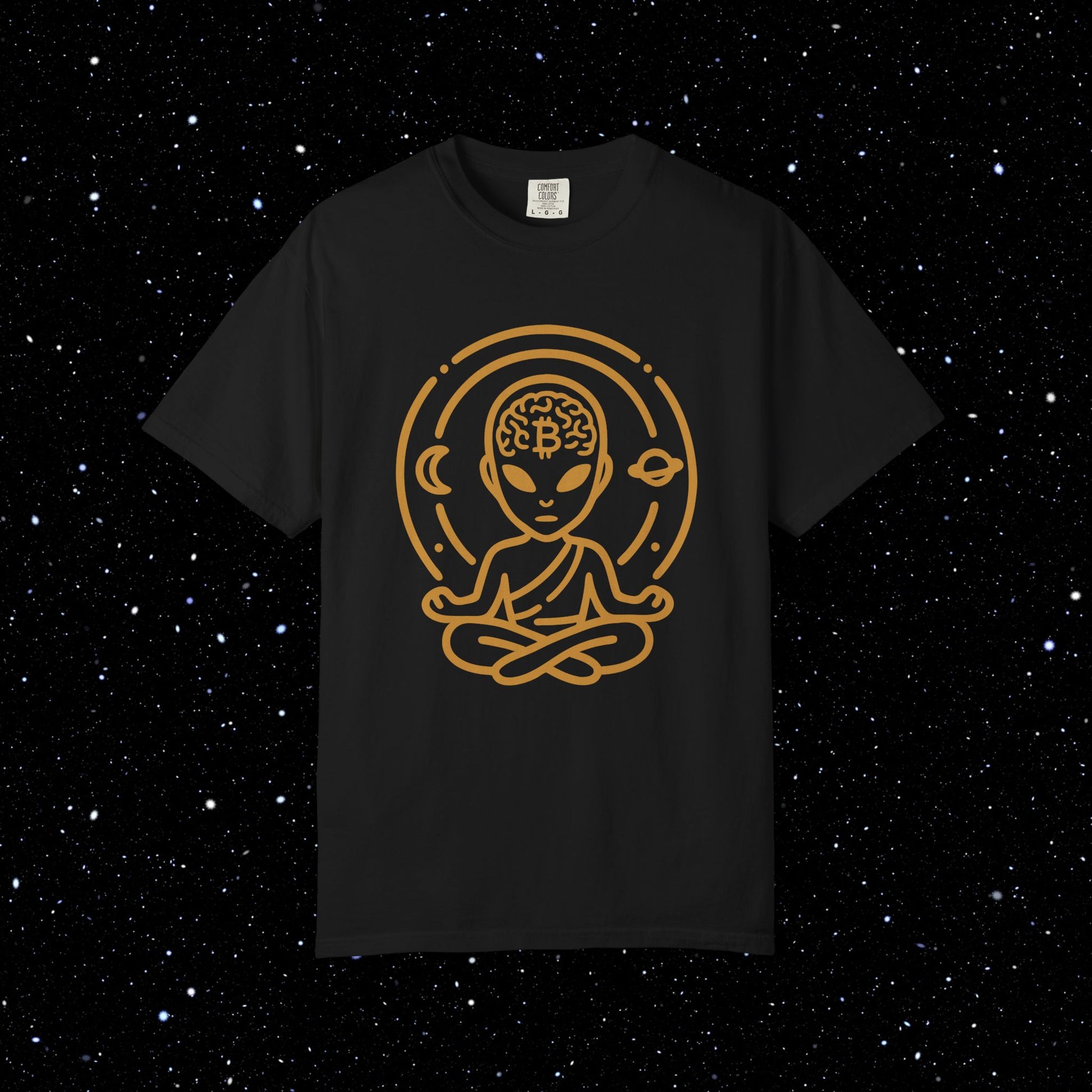 The Moonifestation Tee speaks in riddles of light and code. A figure suspended between planets, eyes closed, consciousness tuned to the frequency of ₿.