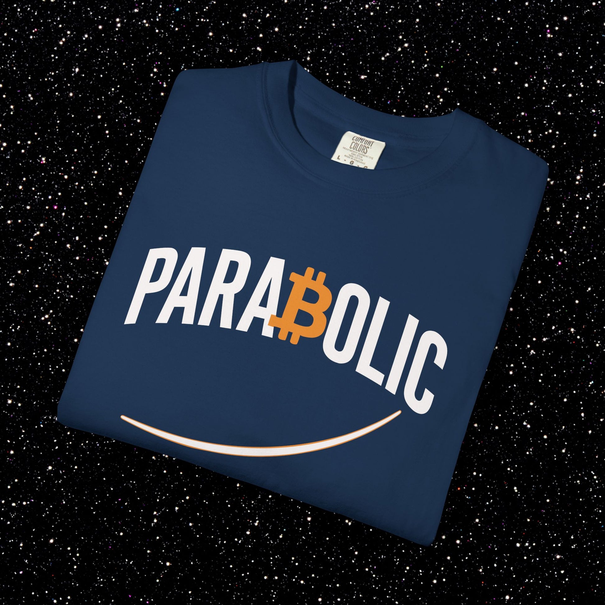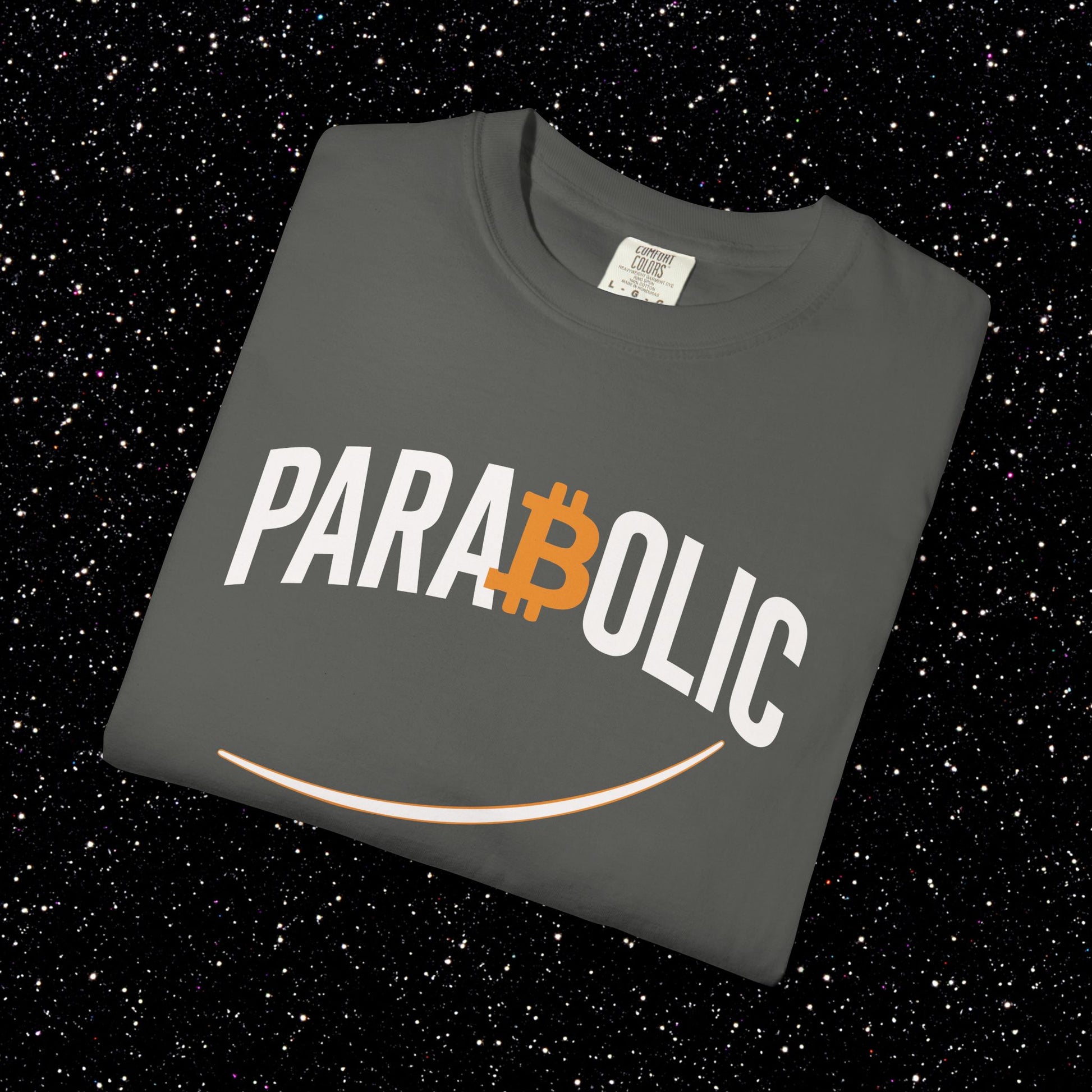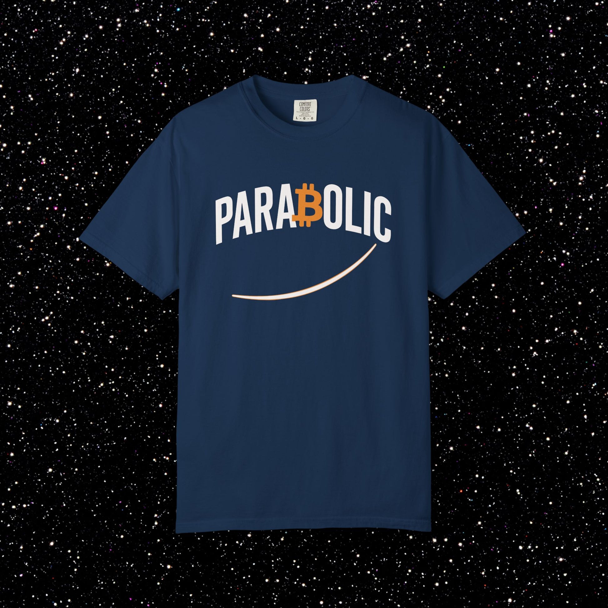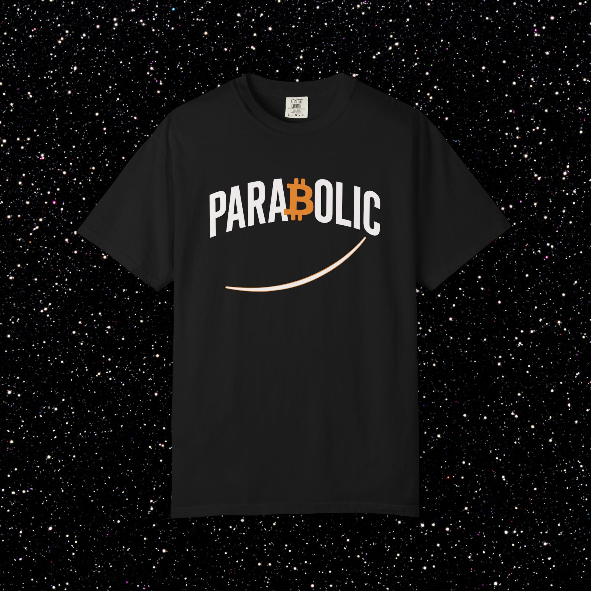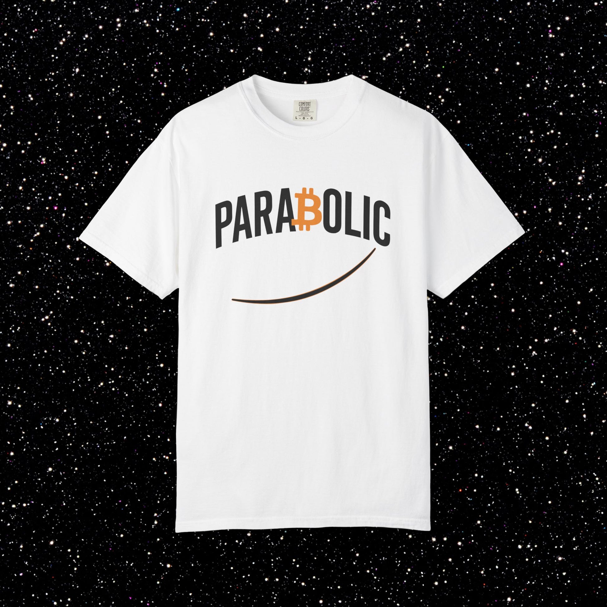 This one’s for the moments when Bitcoin stops crawling and starts going vertical. The PARA₿OLIC Tee keeps it clean with tall streetwear lettering, a bold orange Bitcoin B sitting dead-center in the wordmark, and a smooth rising curve underlining the whole attitude. Minimal. Hard. Built for the days when the chart looks like it’s trying to escape Earth’s gravity.