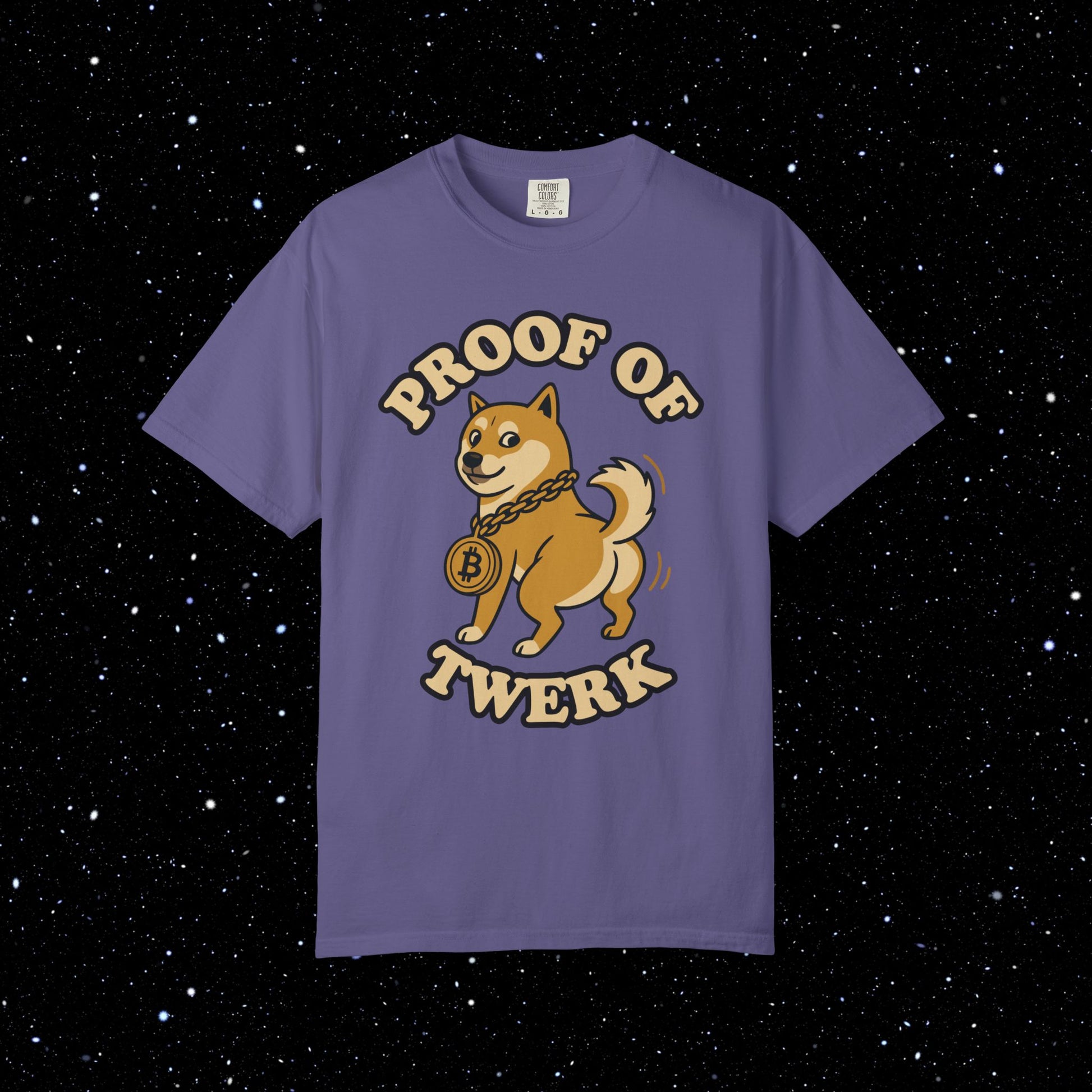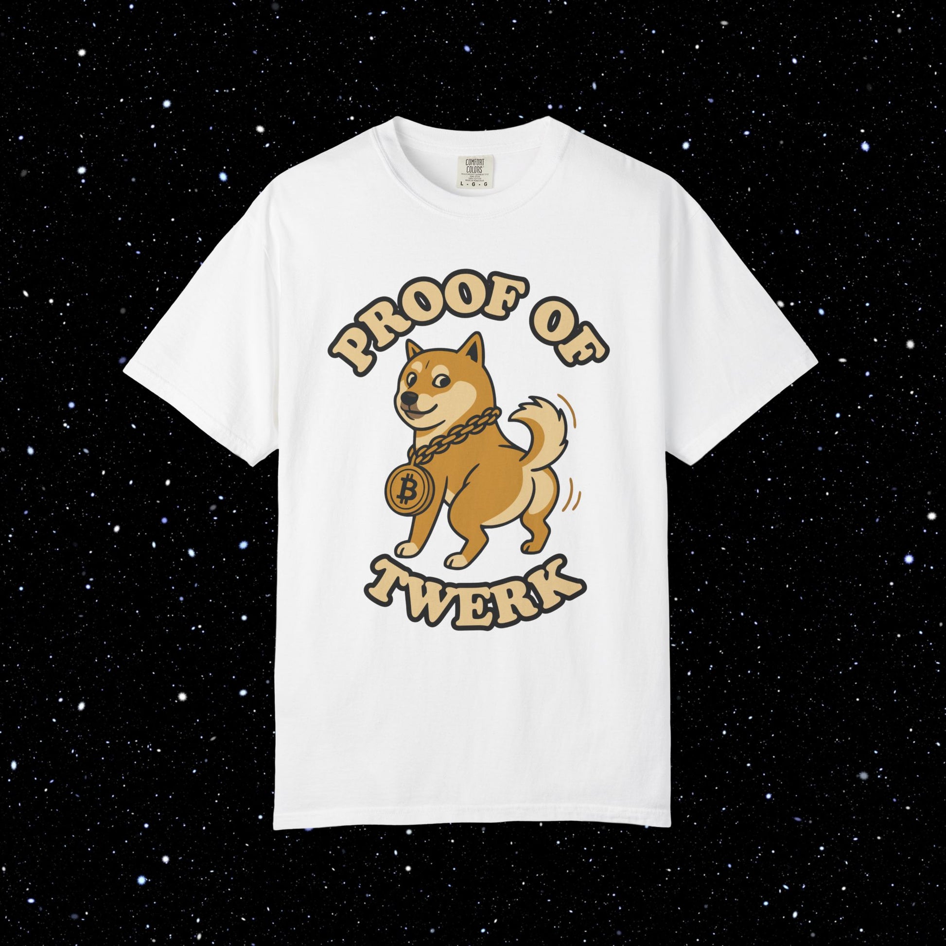 Meet the ultimate meme flex tee, the Proof of Twerk. Featuring the legendary Doge mid twerk with a gold Bitcoin chain, this design celebrates the real proof of work that moves markets and memes alike.