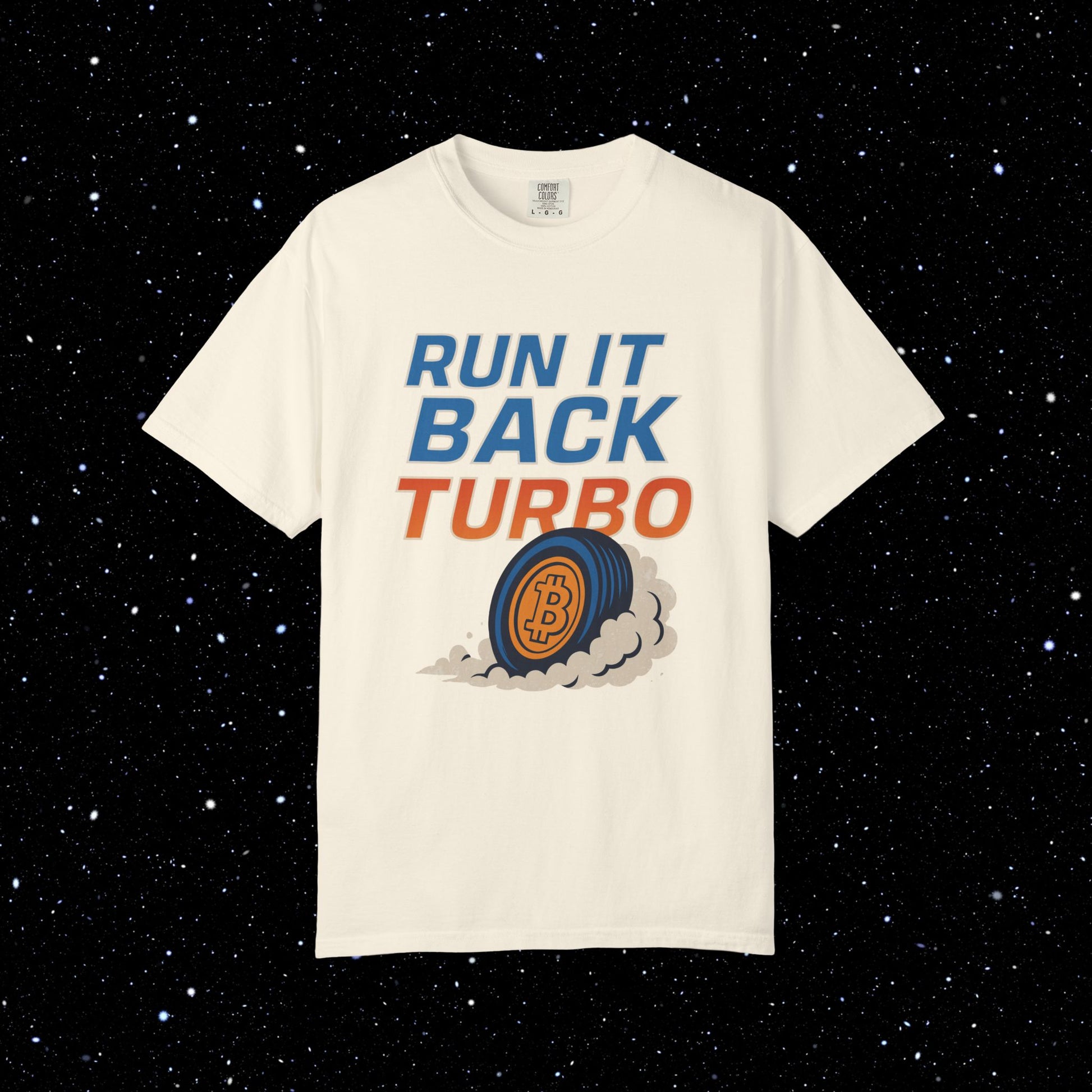When the market resets, real ones reload. The Run It Back Turbo tee captures that momentum shift energy. Bold typography, clean vintage-style smoke, and a Bitcoin tire spinning up for another run. A simple, confident design for those who know the game doesn’t end after a dip.