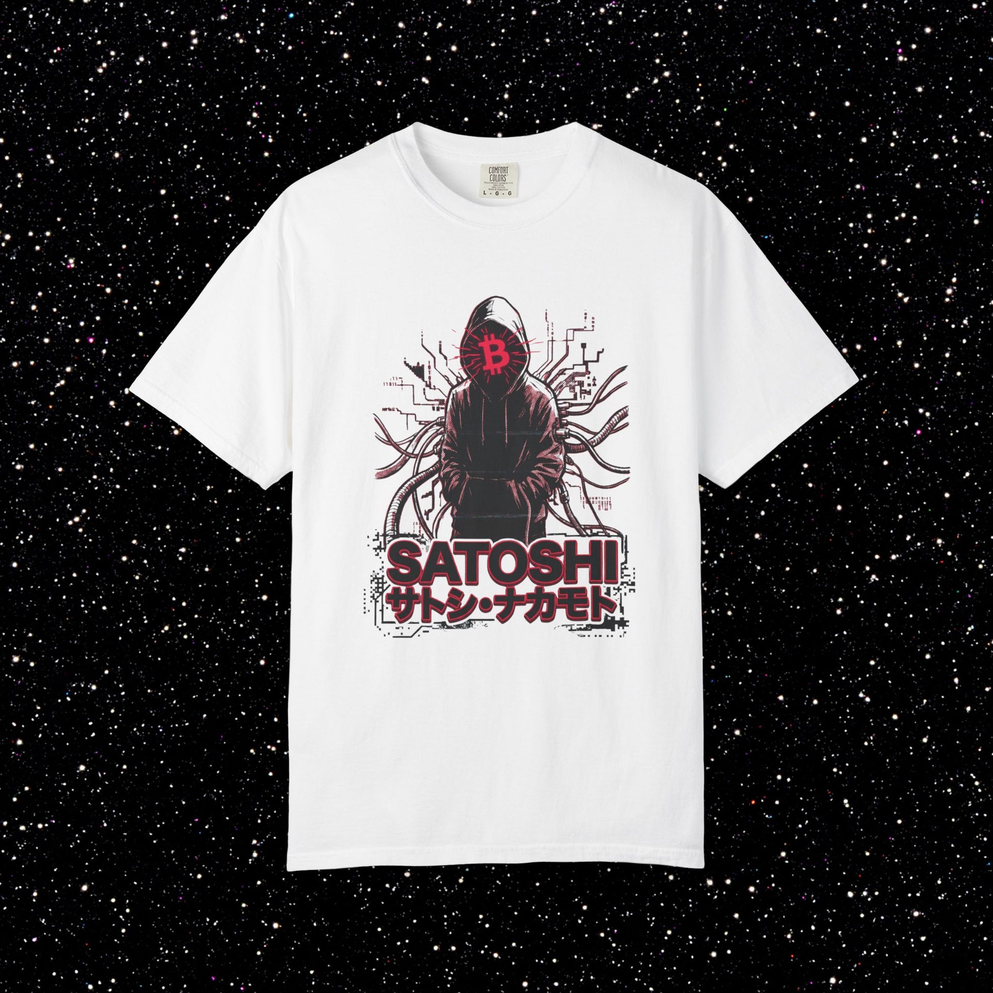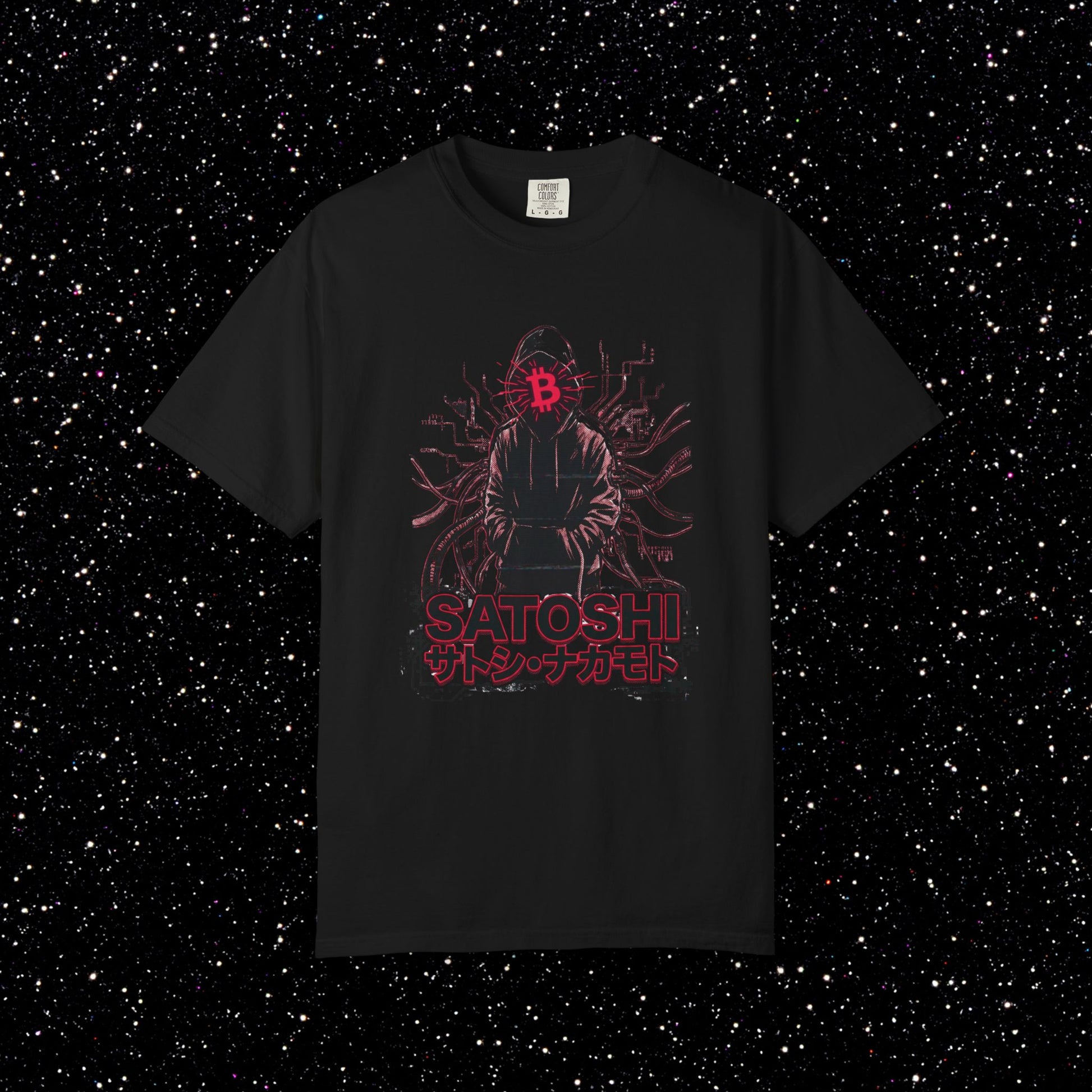 Below the figure, SATOSHI is stamped in bold, with the name repeated in Japanese katakana. It reads like a tag left behind after the system was set in motion.