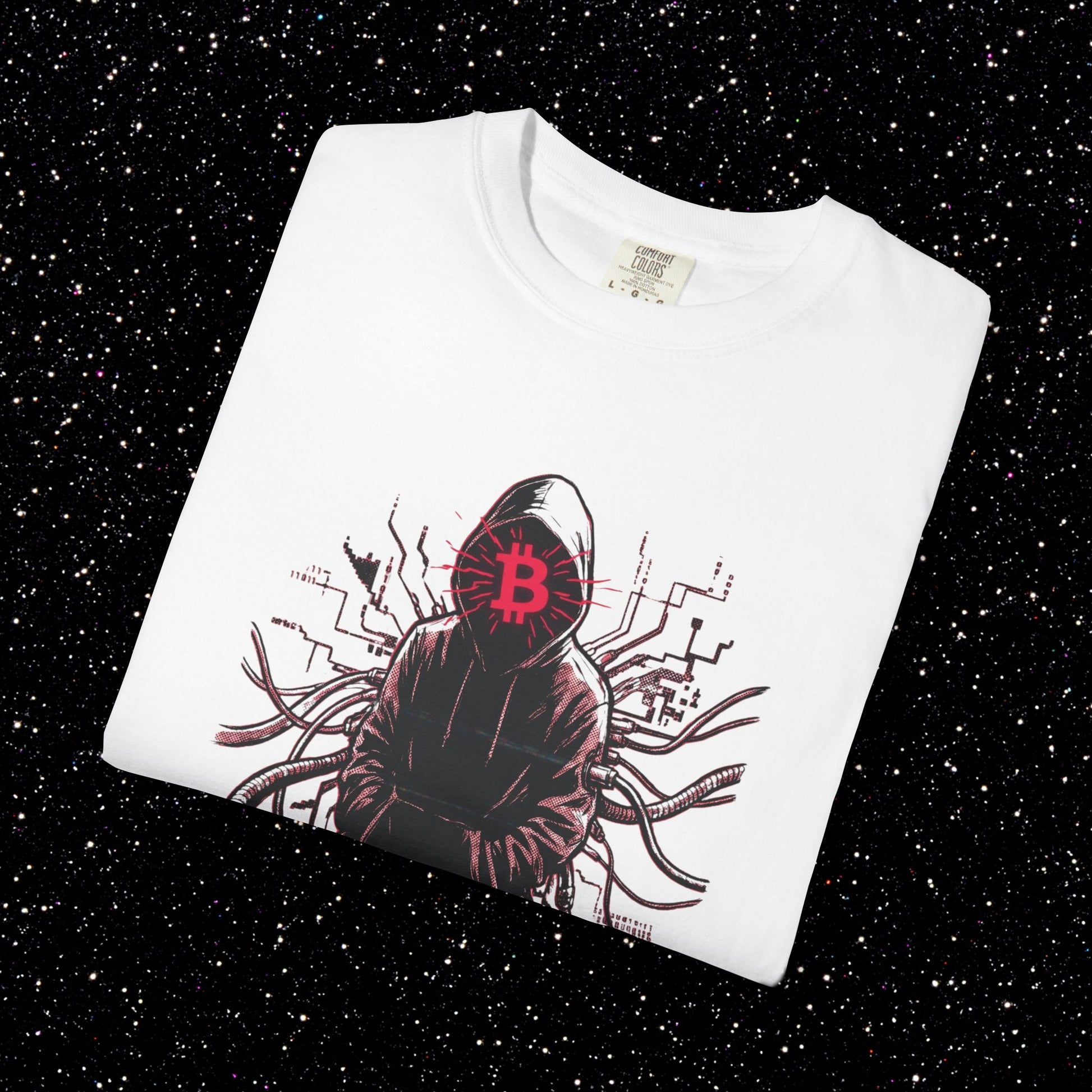 A hooded figure stands at the center, face replaced by the Bitcoin symbol. No identity. No expression. Just signal.