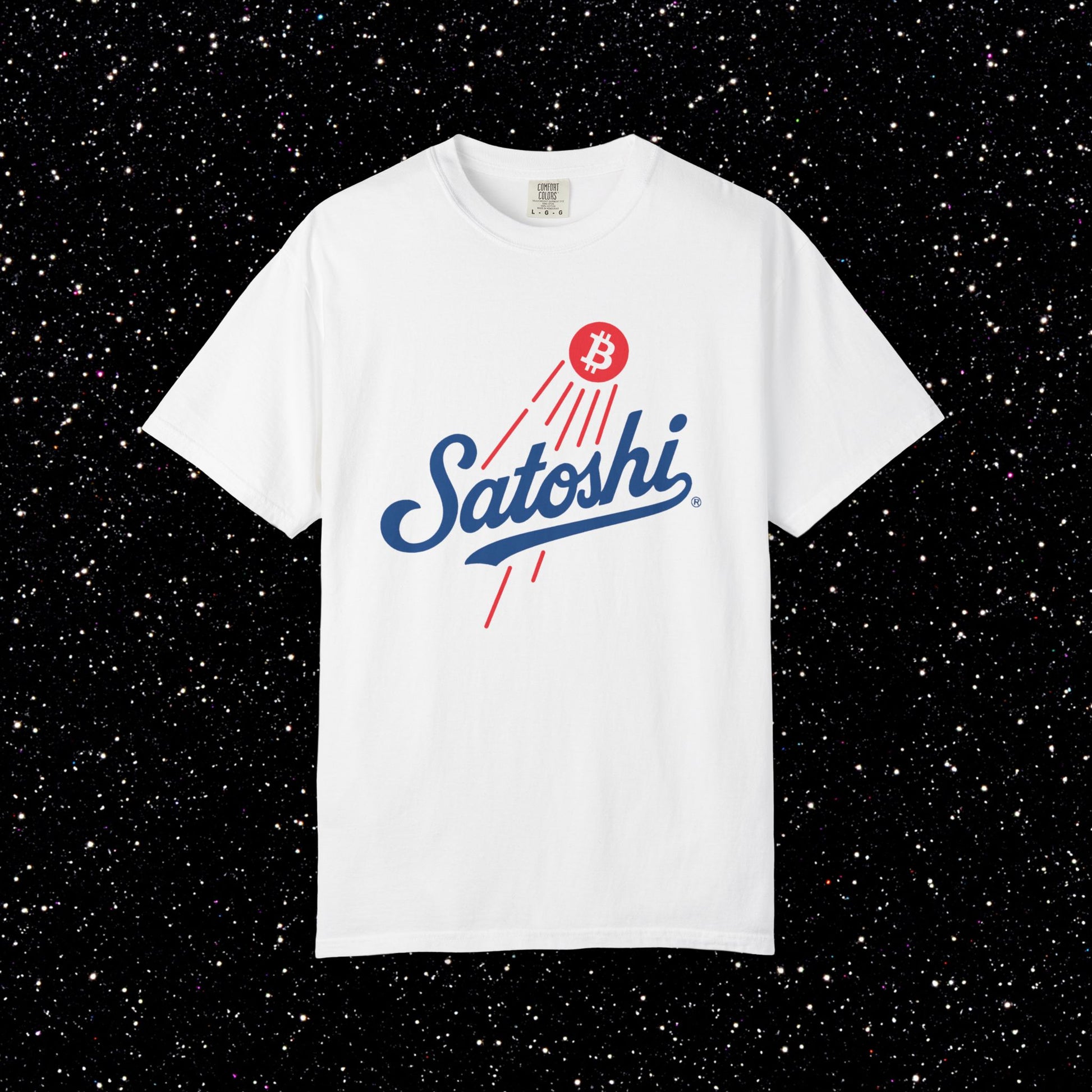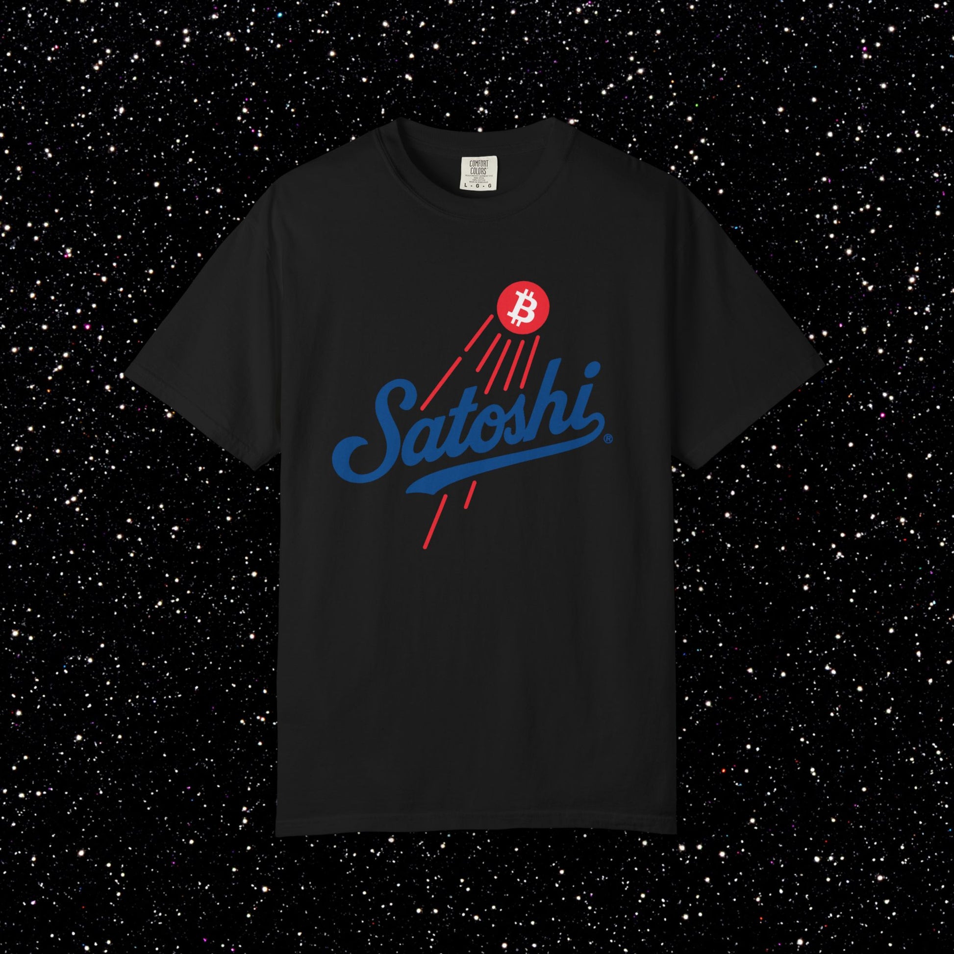 A clean homage to one of the most iconic sports logos ever, reimagined for the Bitcoin era. The flowing “Satoshi” script hits in Dodger blue with bright red motion streaks and a Bitcoin symbol soaring overhead. It’s retro, bold, and instantly recognizable. Perfect for fans who rep Bitcoin culture with that vintage athletic energy.