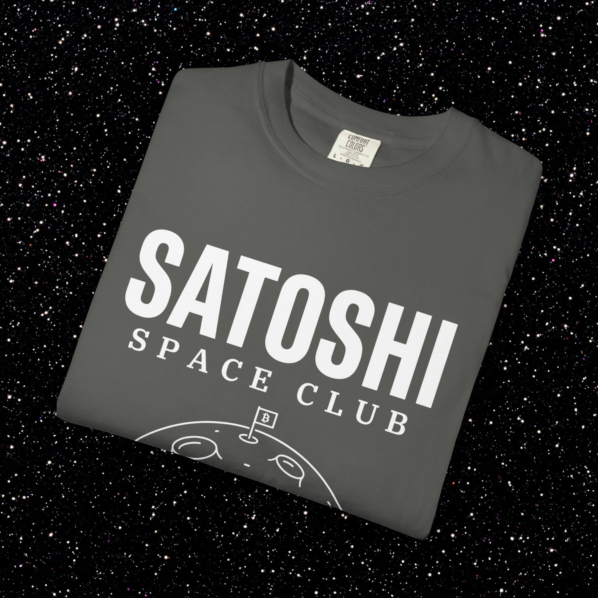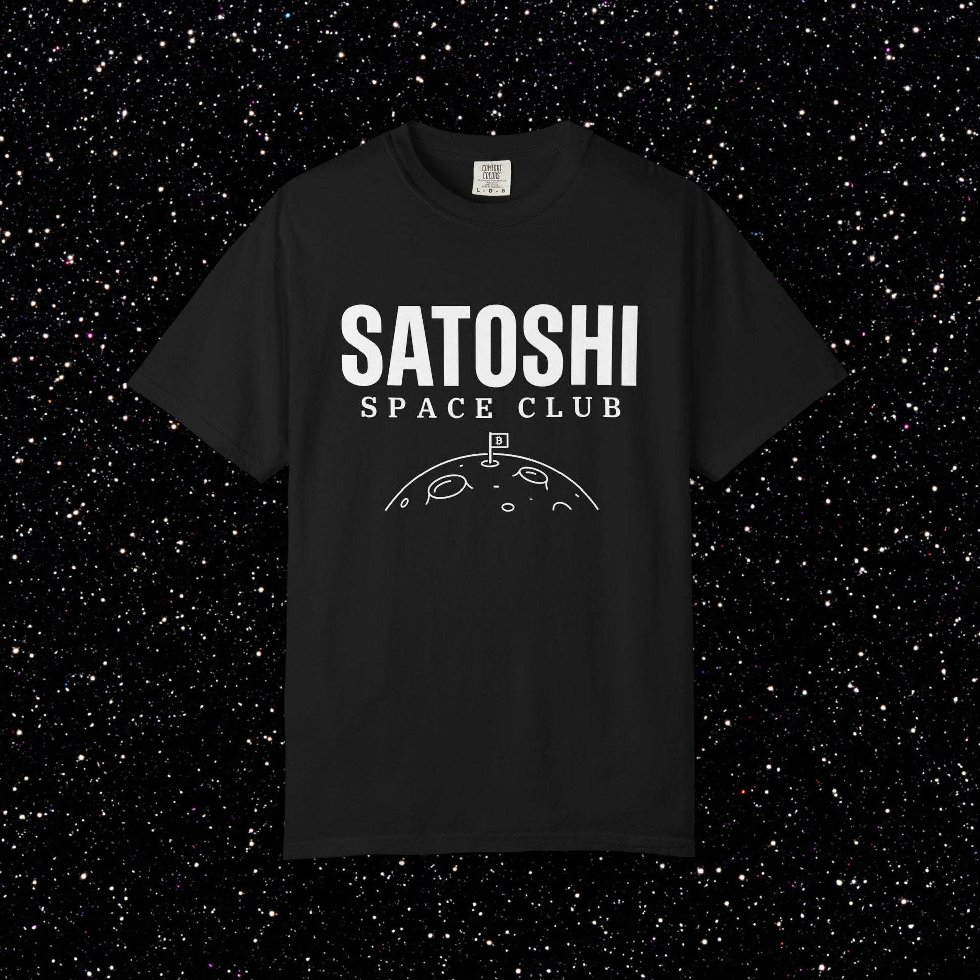 The Satoshi Space Club tee pairs bold typography with a quiet symbol of arrival. Clean lettering up top. Below it, a minimalist moon horizon and a small Bitcoin flag. Nothing loud. Nothing wasted.
