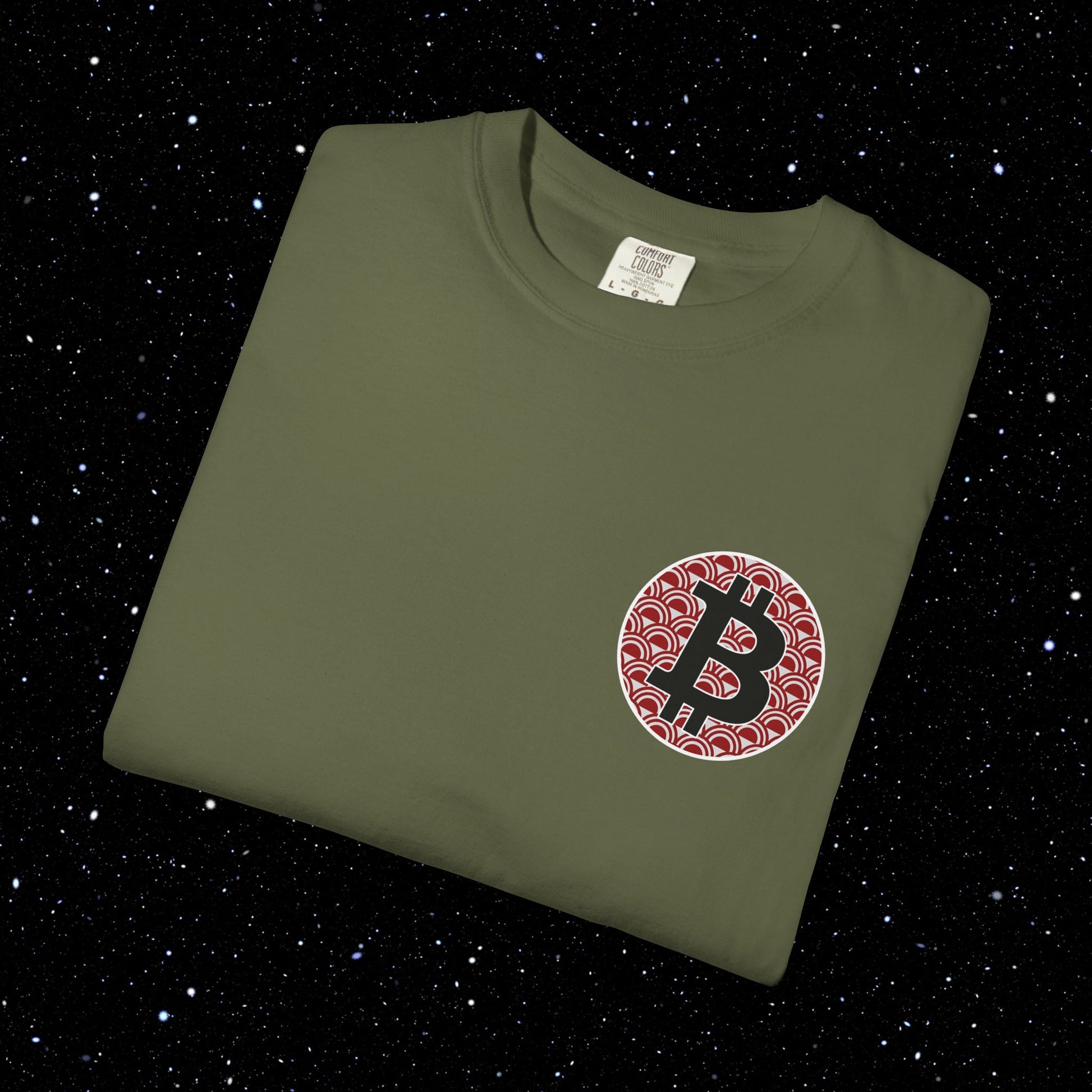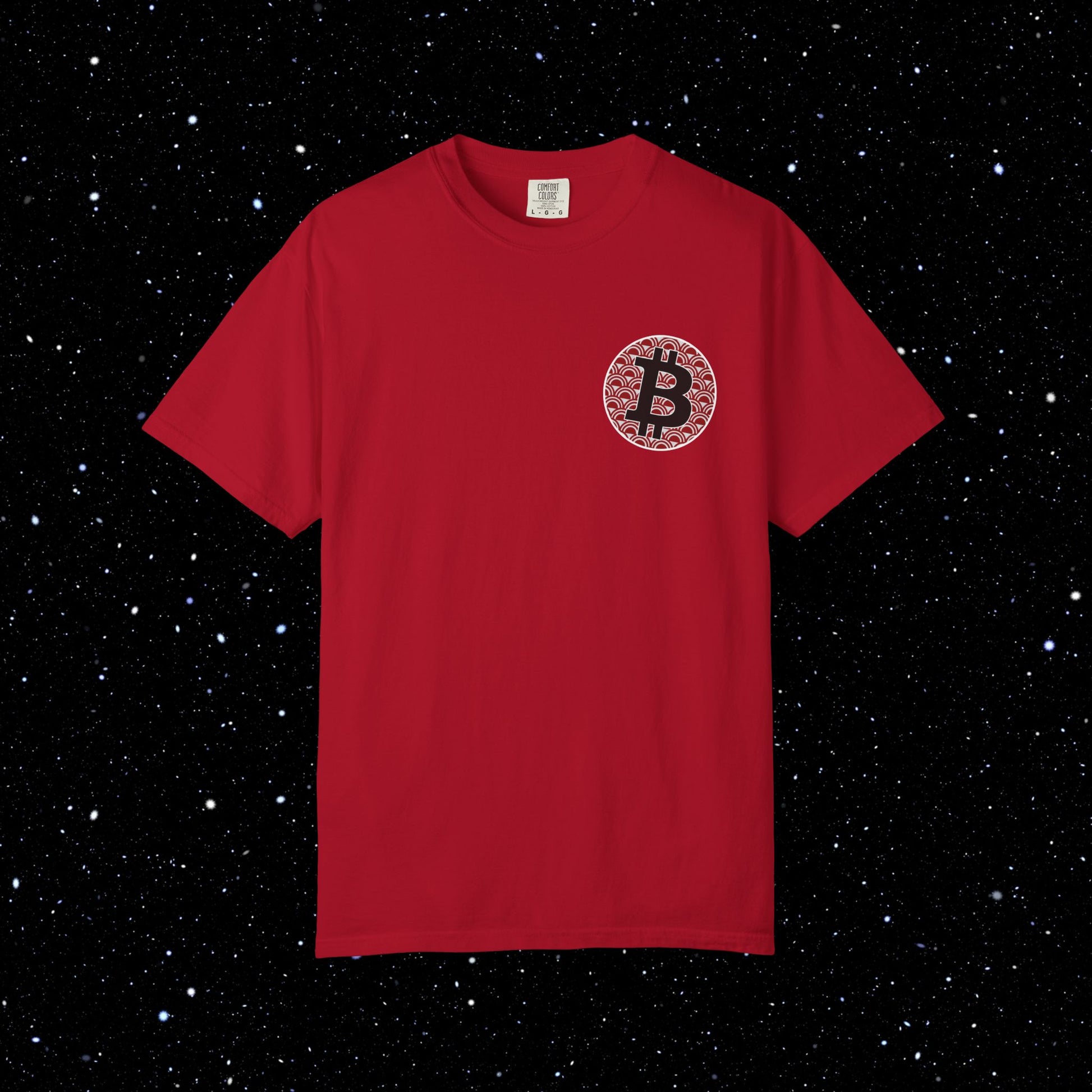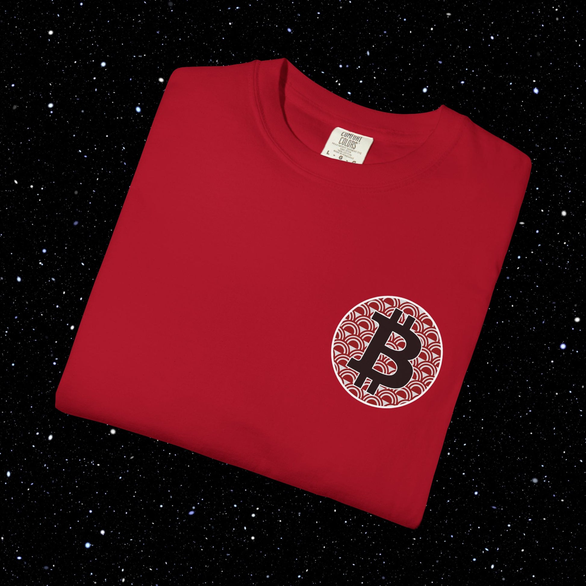 The Satoshi Wave Tee blends minimalism with tradition. Featuring the Bitcoin logo filled with a red Japanese wave pattern, it symbolizes resilience and rhythm through every market tide.