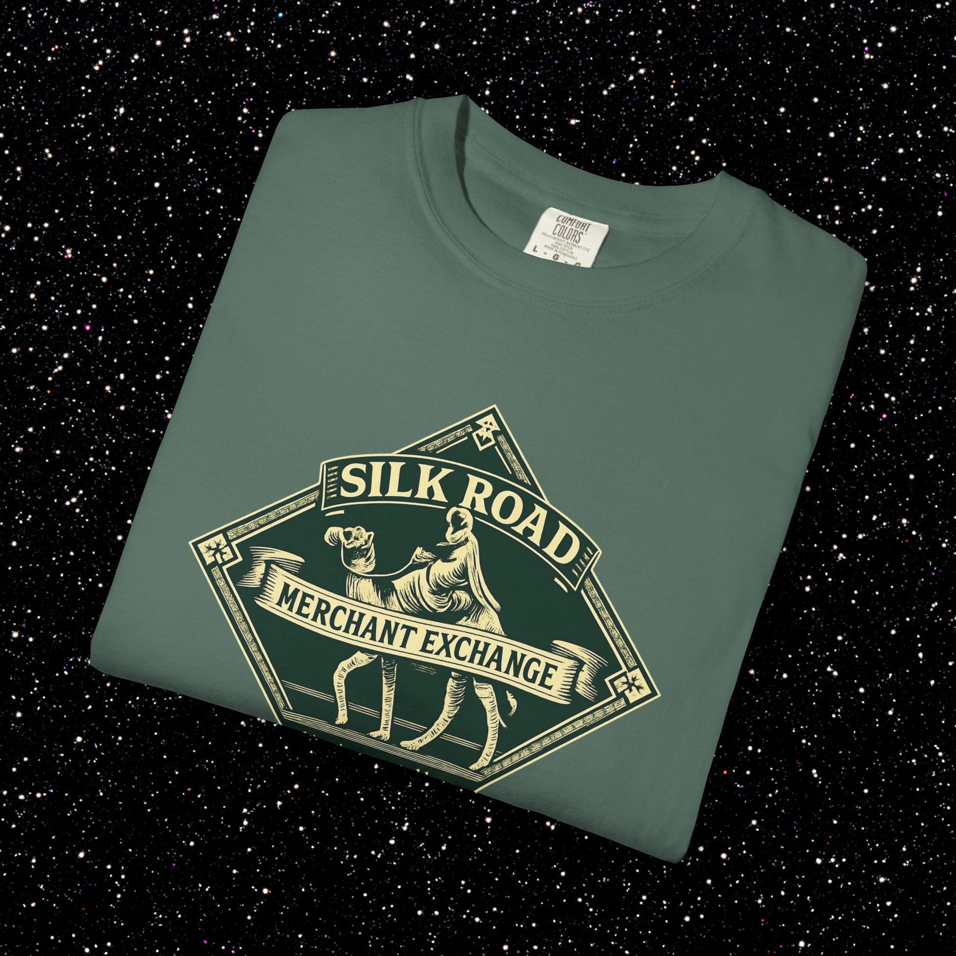 The Silk Road Merchant Exchange tee reimagines ancient trade through a modern Bitcoin lens. Inspired by historic merchant guilds and long-distance commerce, this design features a dignified camel merchant emblem set in a classic diamond badge, finished with the phrase “Bitcoin accepted here.”