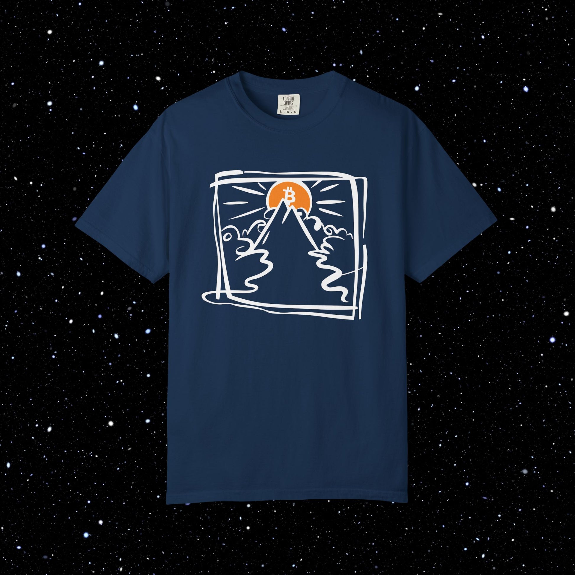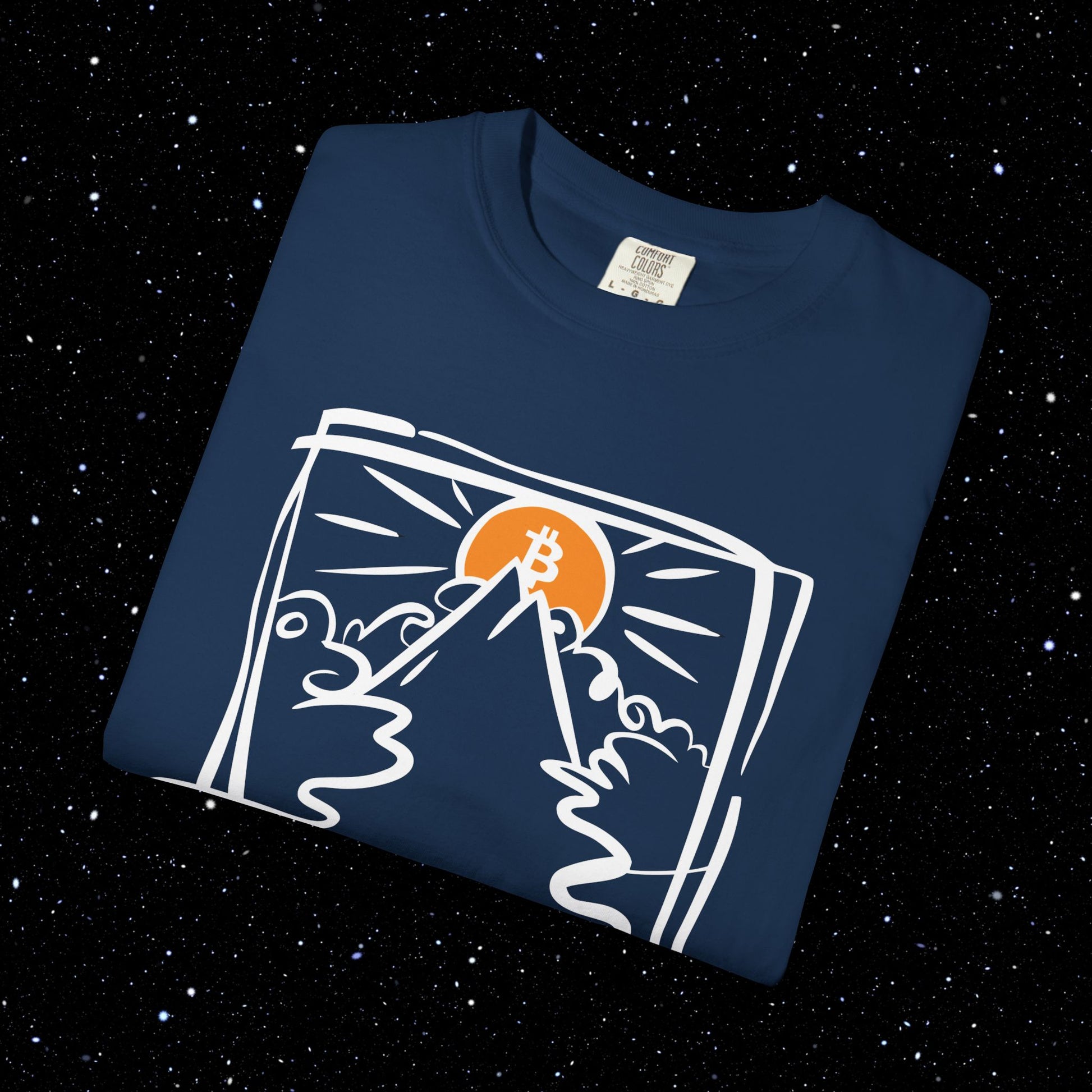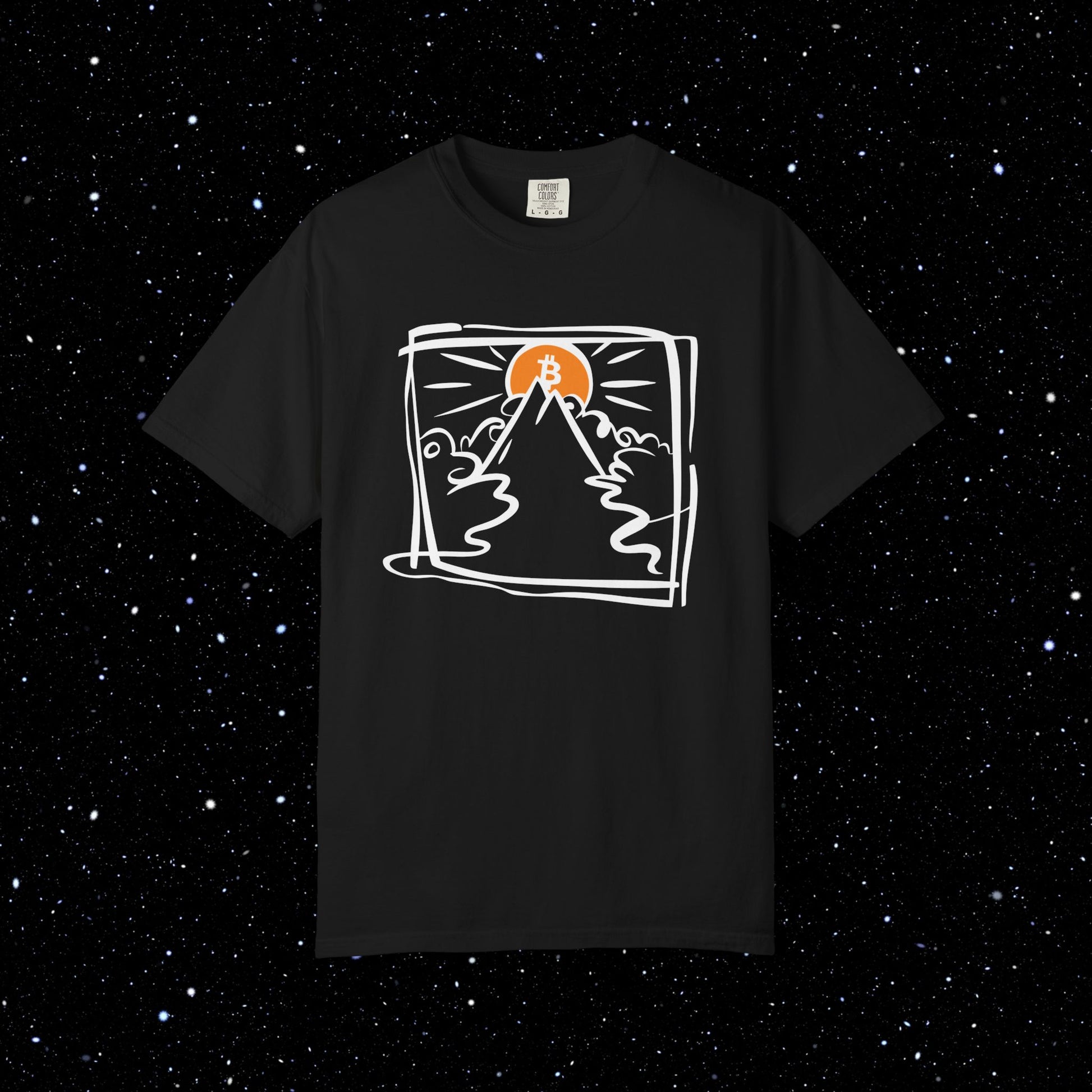 The journey’s the point. This minimal line-art tee captures the climb toward the Bitcoin sun, a symbol of conviction, clarity, and staying the course.