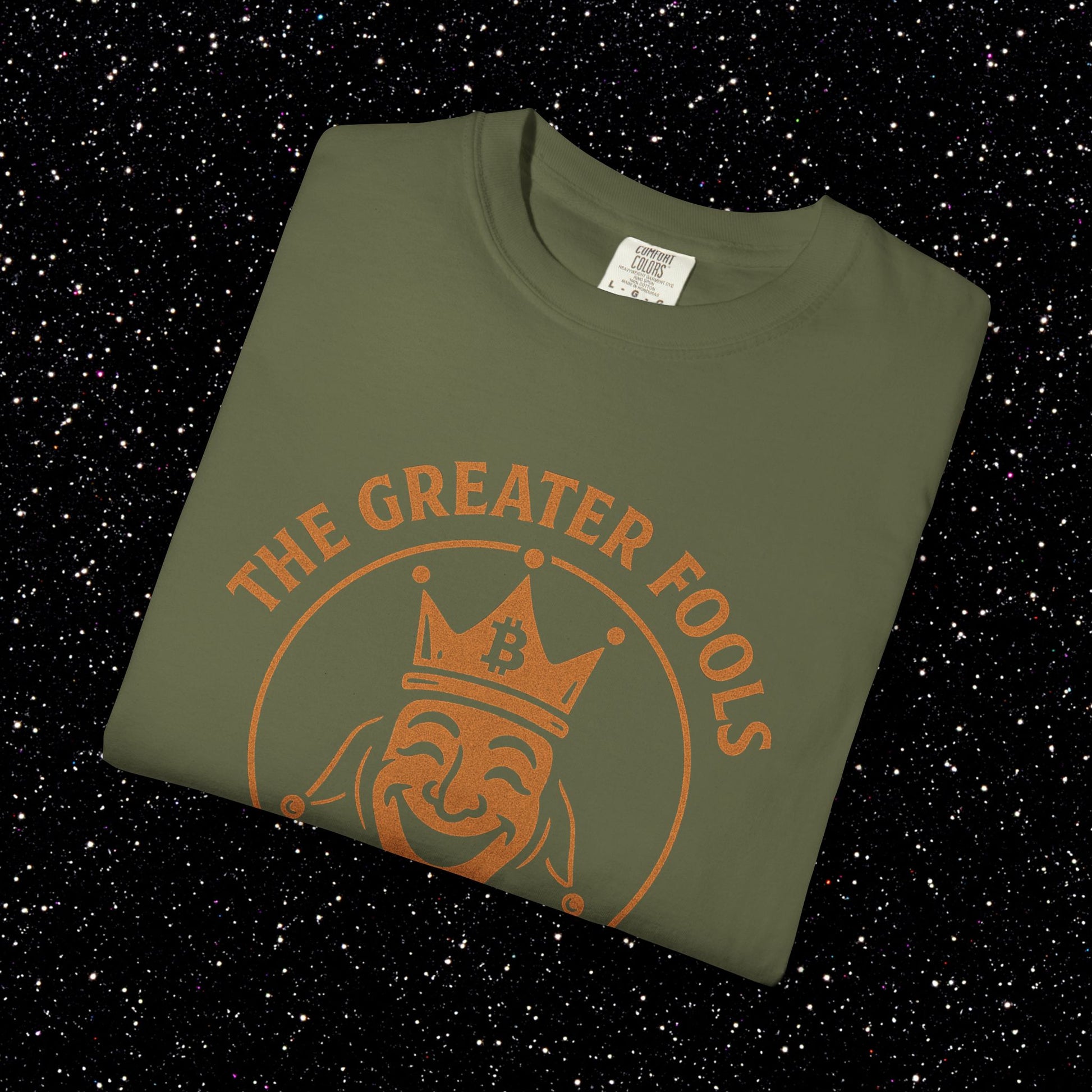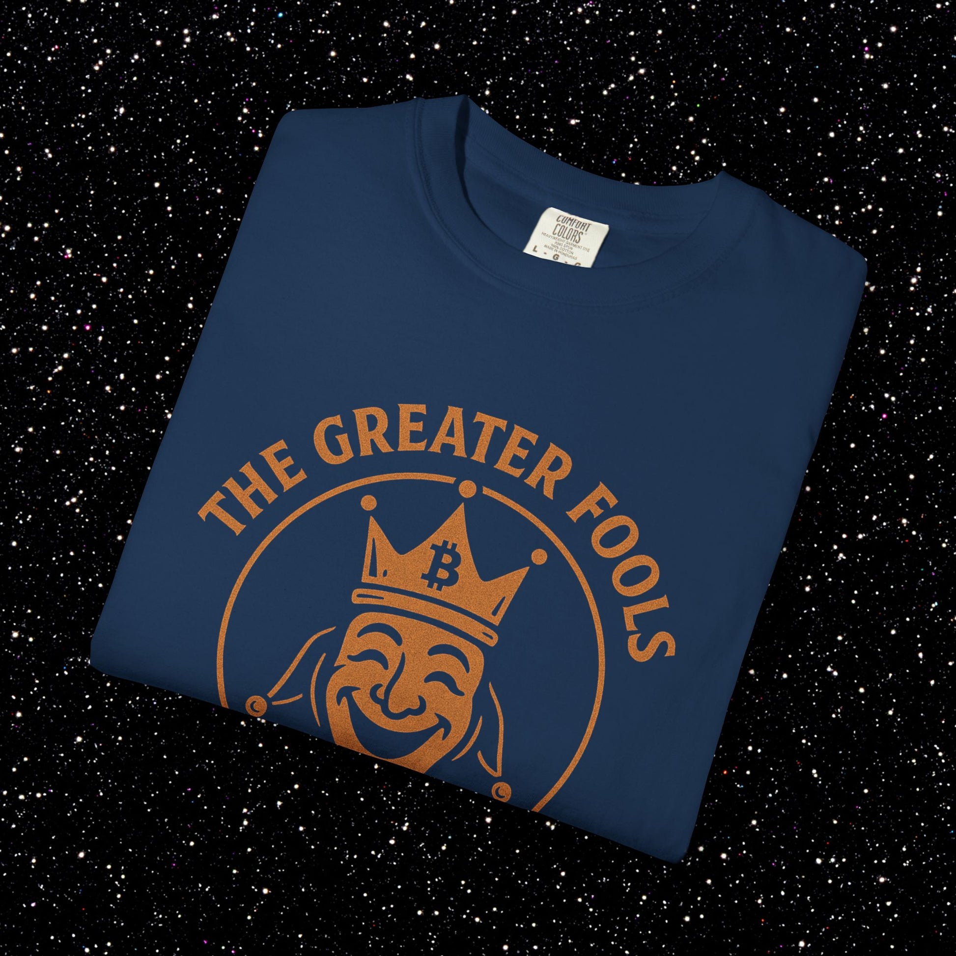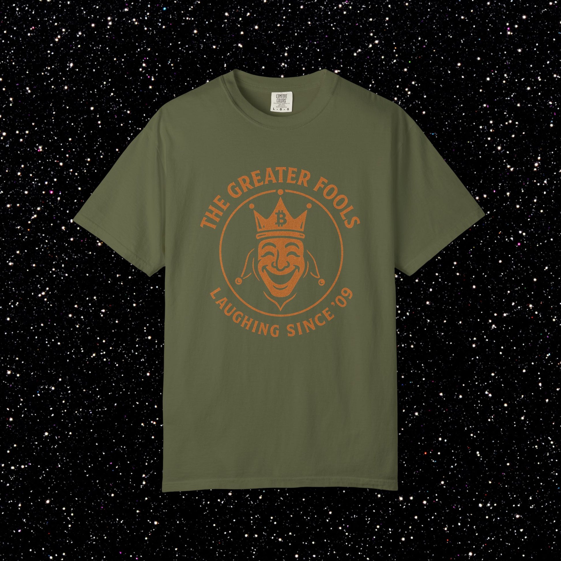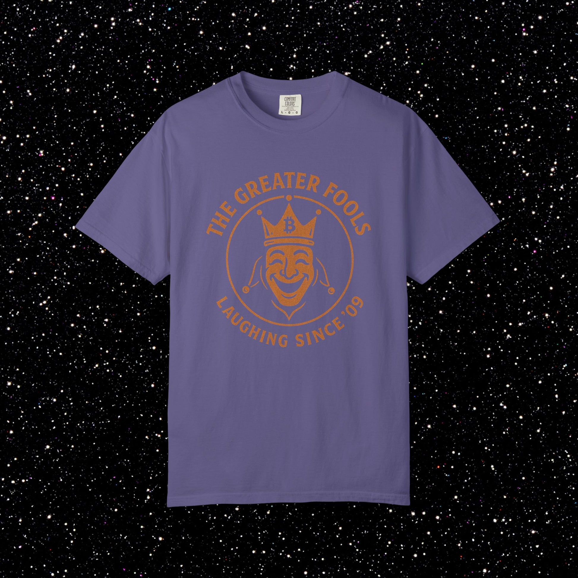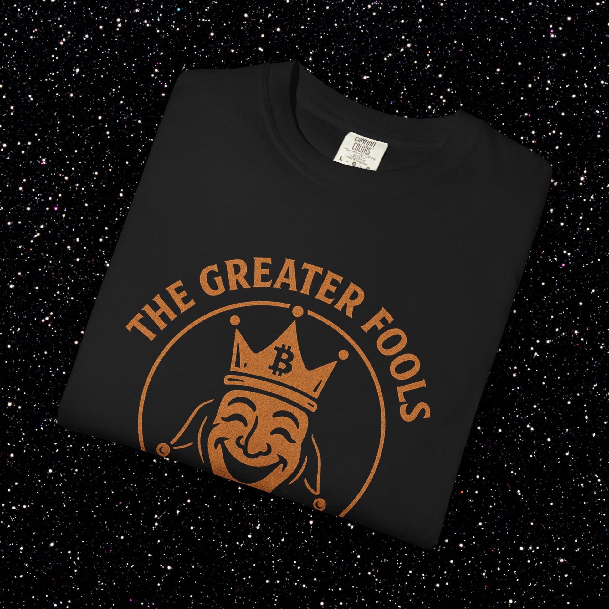 This tee features The Greater Fools emblem, a crowned jester marked with the Bitcoin ₿, grinning at every “bubble” since 2009. A nod to those who laughed last while stacking through every crash and headline.