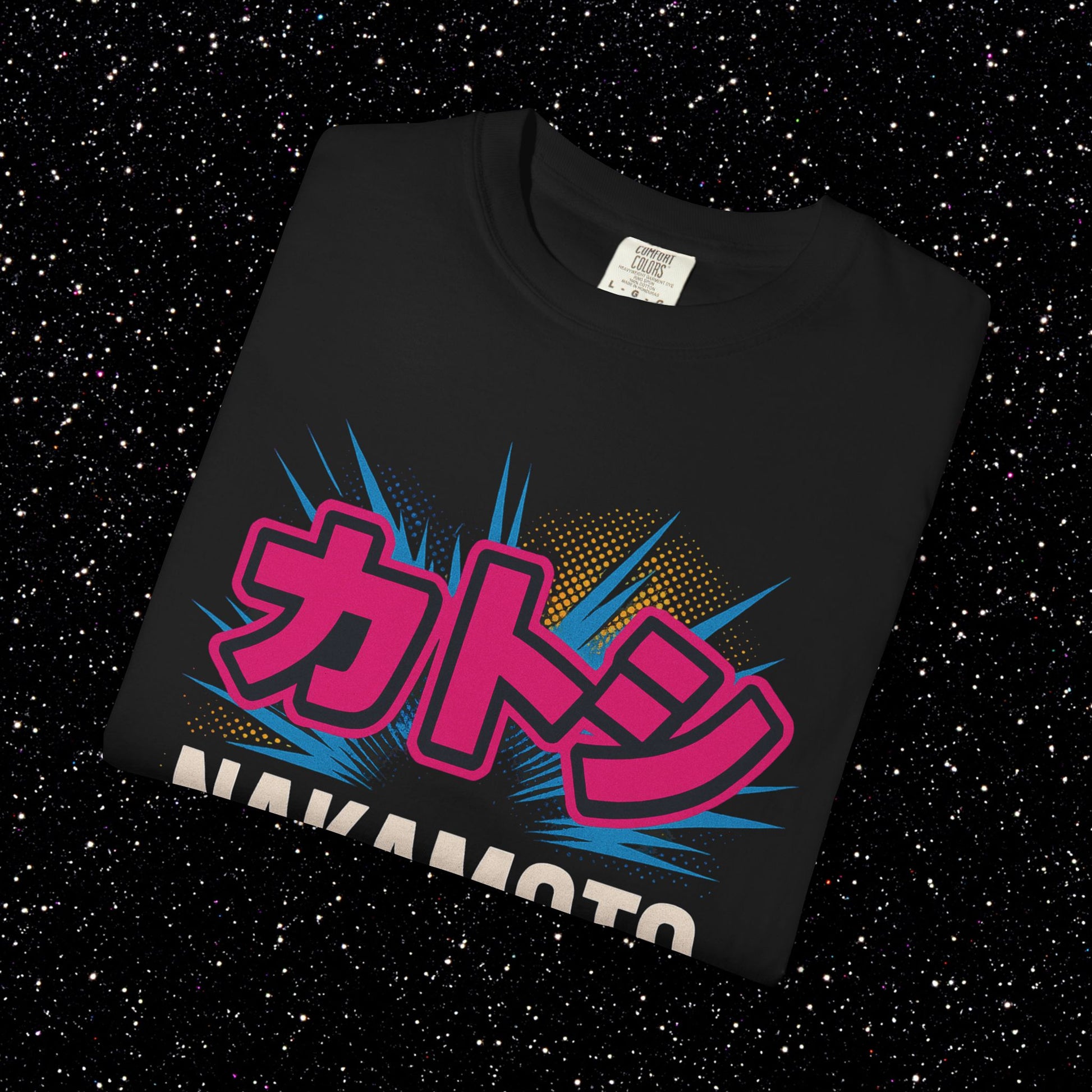 A loud and fast streetwear graphic built for Culture Maxis. Bold anime サトシ lettering up top, blocky NAKAMOTO across the middle, and a punch of tangerine spray underlining the whole thing. Halftone dots and comic action lines give it a Tokyo night energy that pops on black.