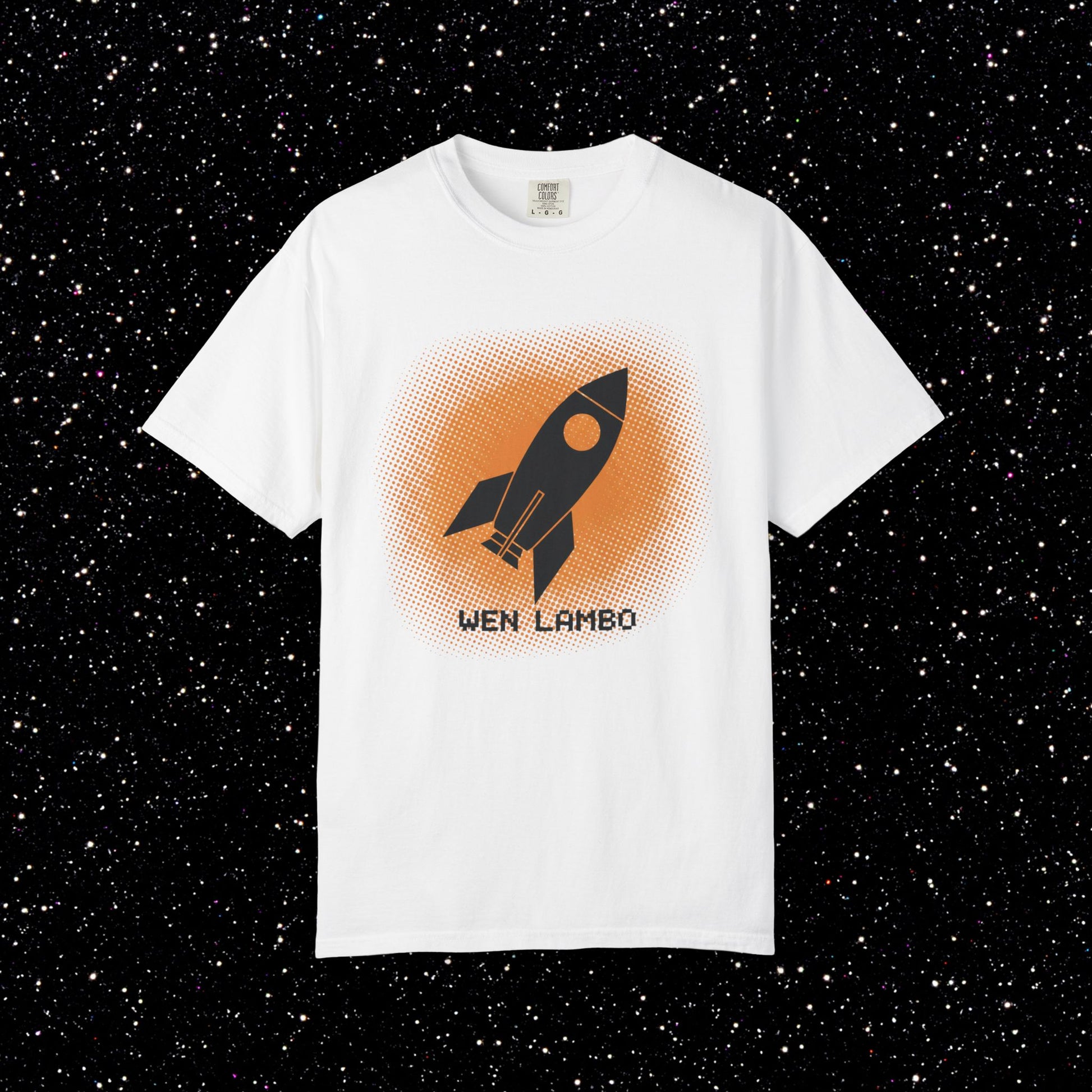“Wen Lambo” started as a meme, but it stuck because it captures the impatience, the hope, and the chaos of the early days. This design leans into it with a clean rocket launch, halftone glow, and zero apology.